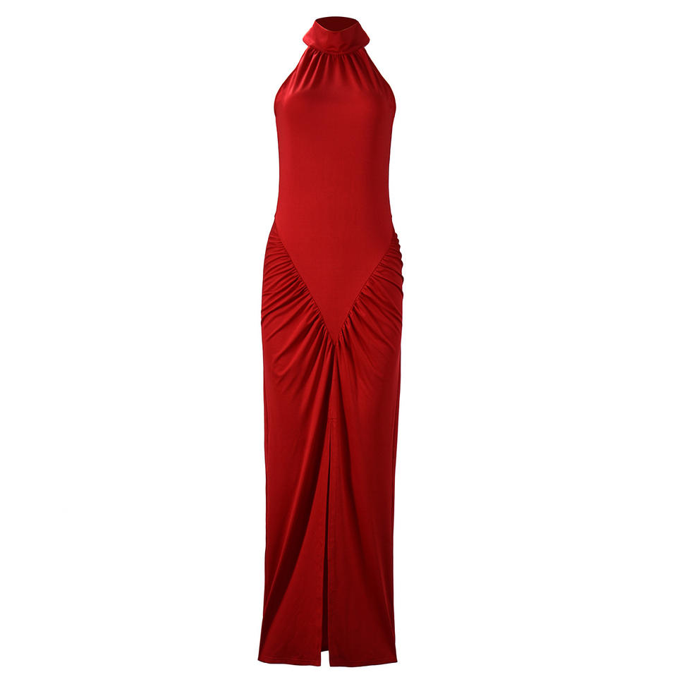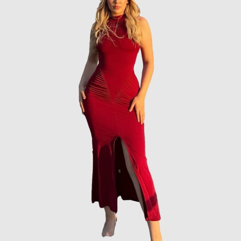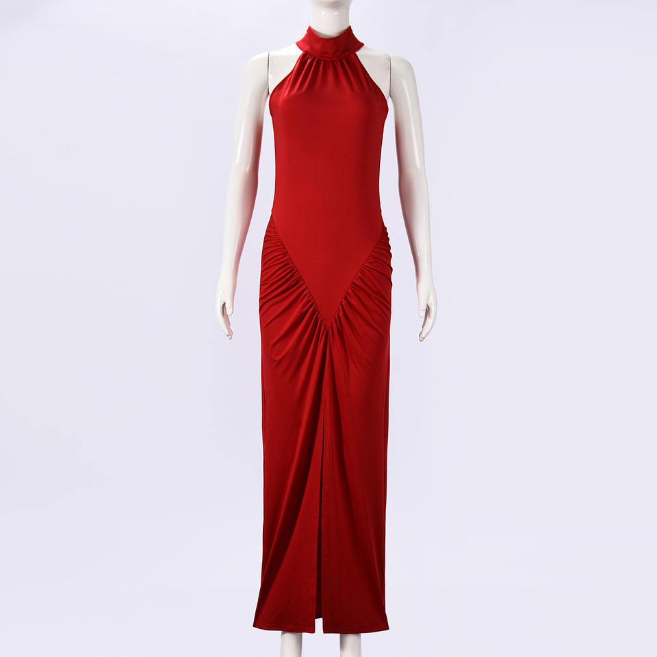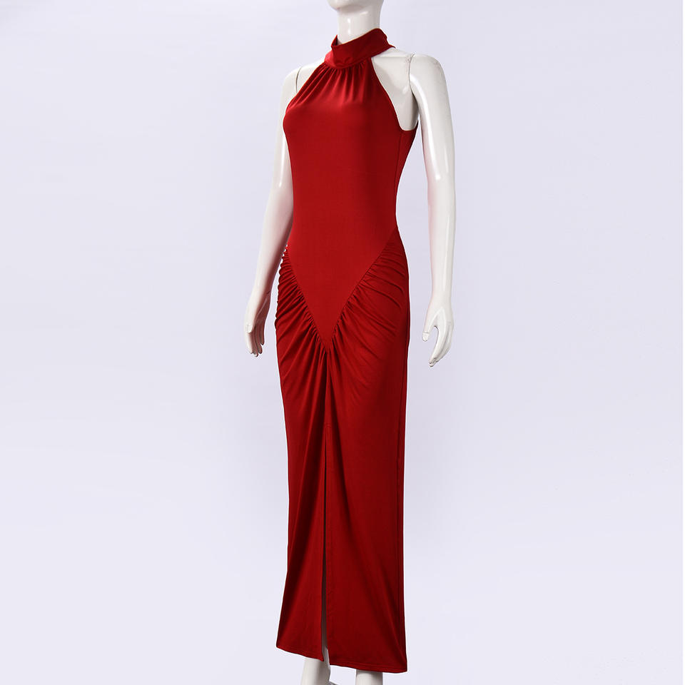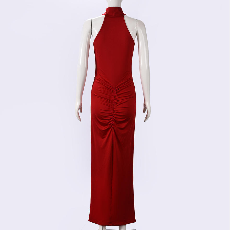 เดรสยาวเข้ารูปมีเชือกคล้องคอแขนกุดแฟชั่นของผู้หญิงมาใหม่