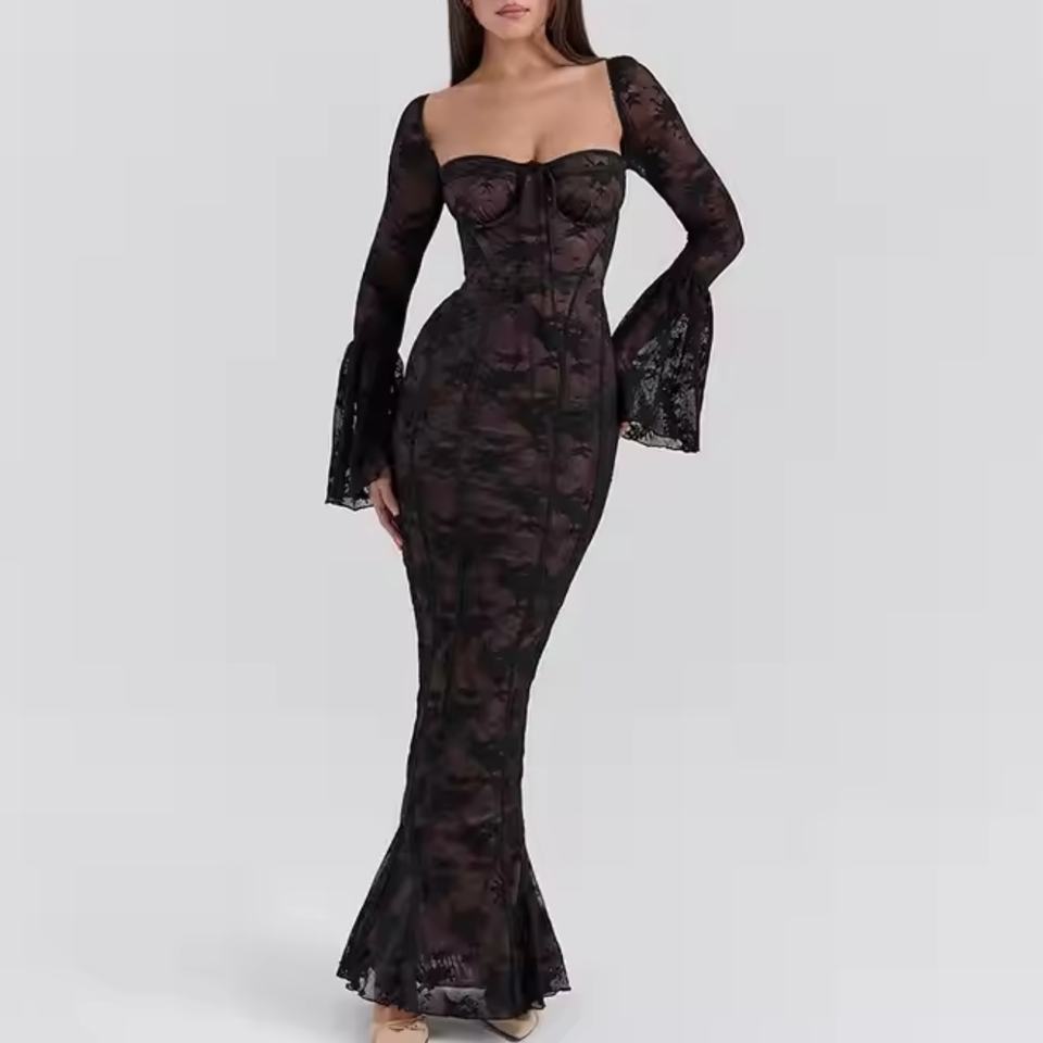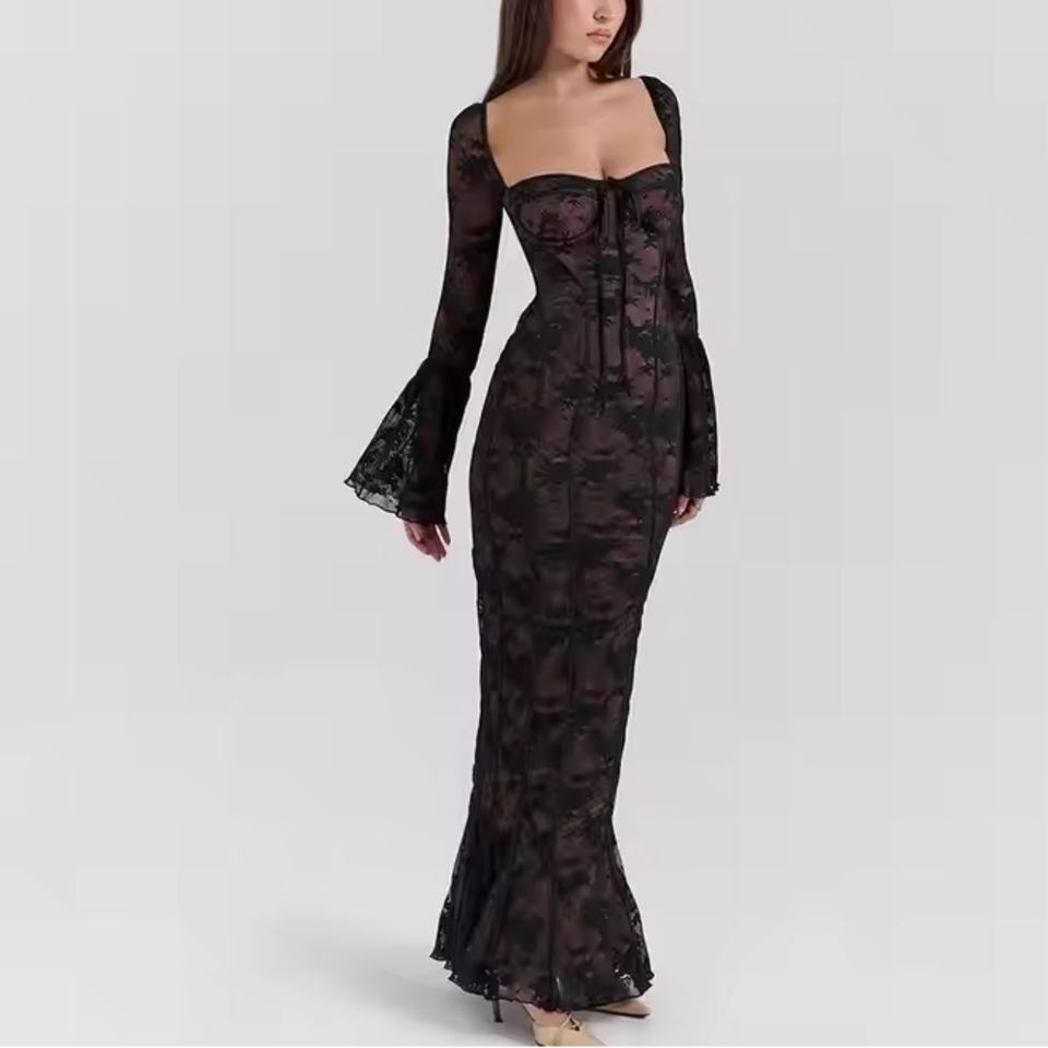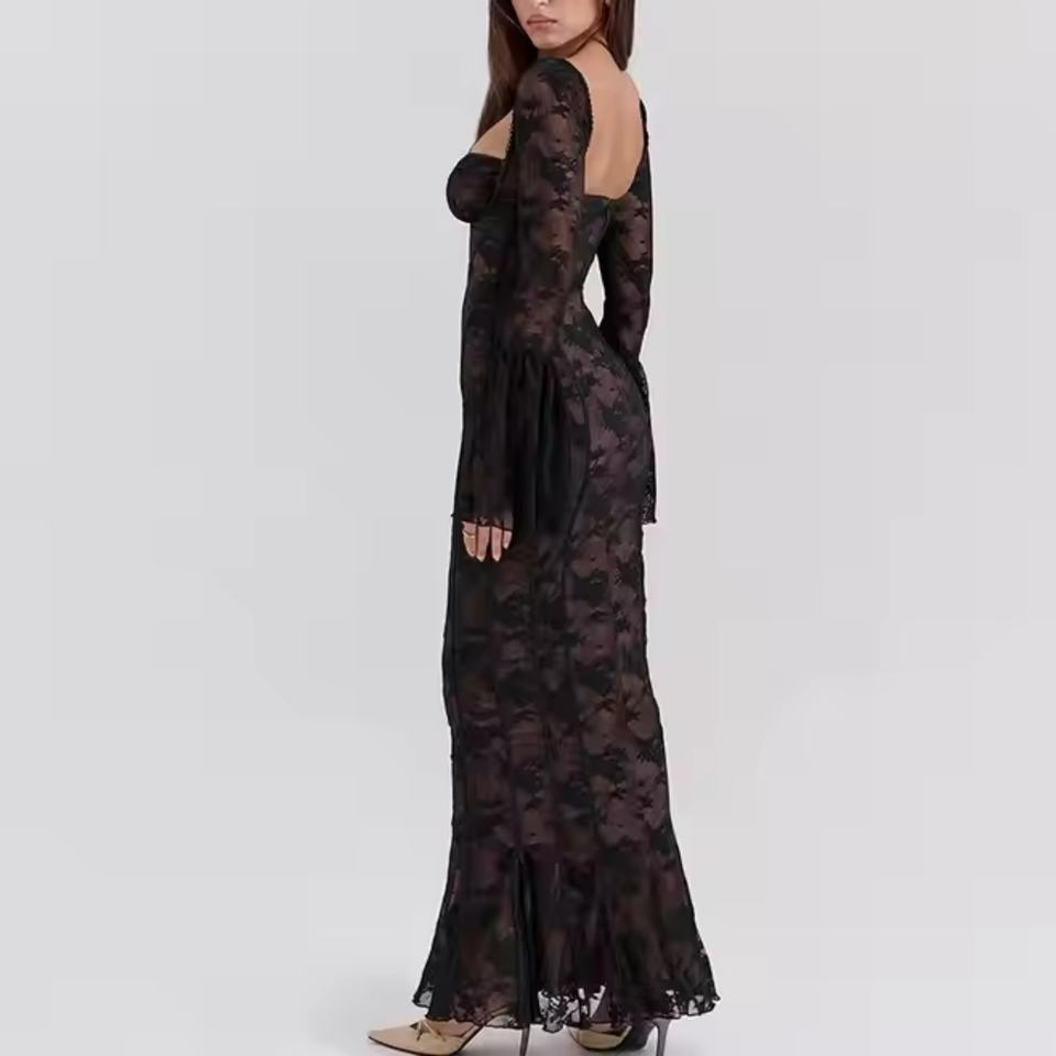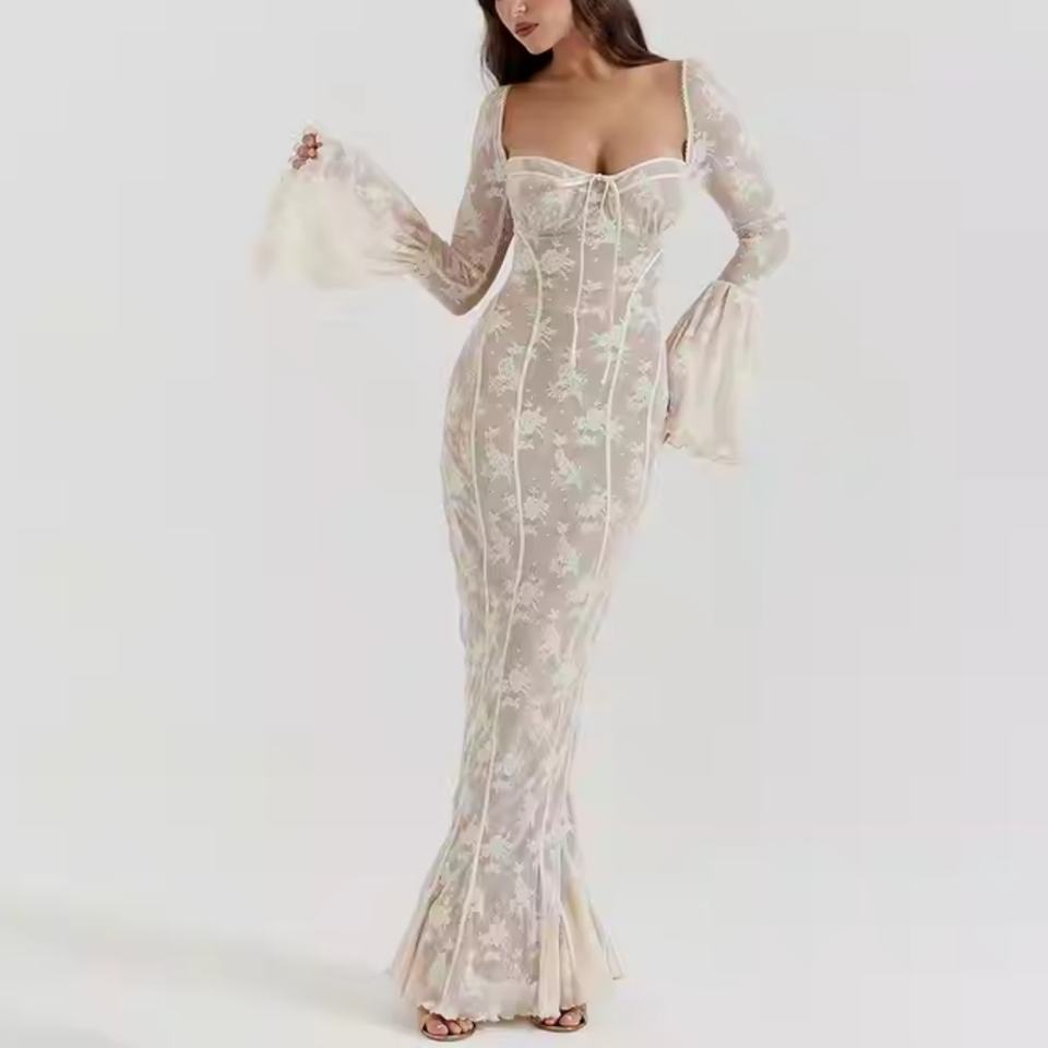 เดรสลูกไม้ฤดูใบไม้ร่วงแบบใหม่ ราคาถูก คุณภาพสูง แขนยาว คอเหลี่ยม เปิดหลัง ทรงเข้ารูป ยาวแบบแม็กซี่ สำหรับผู้หญิง