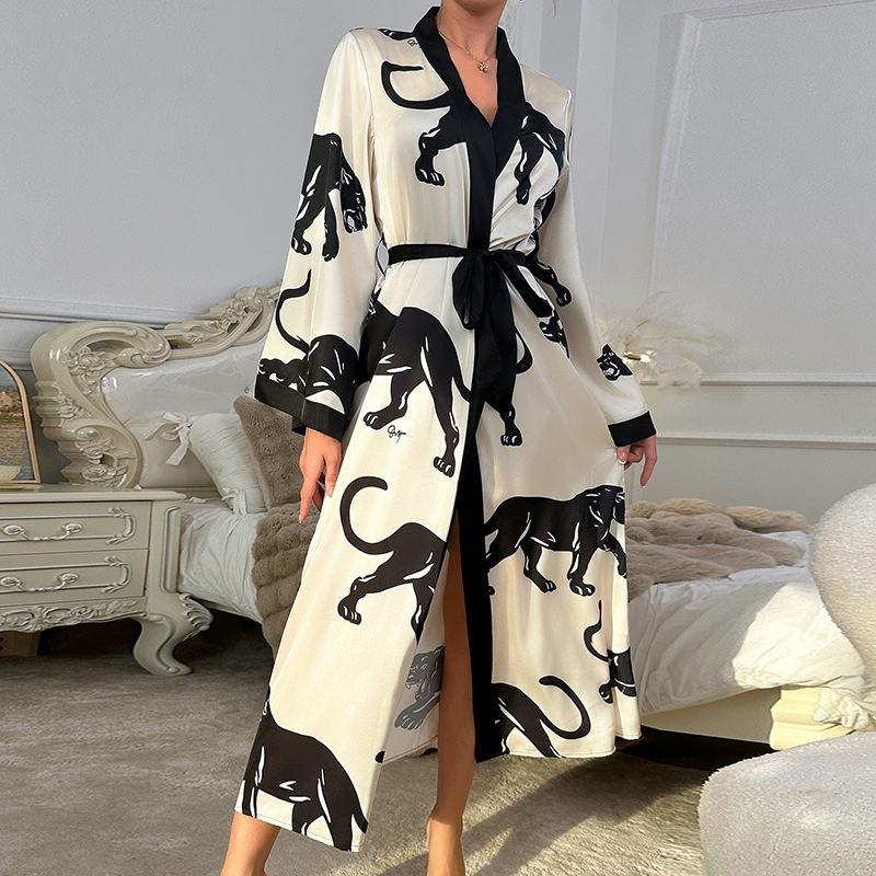 เสื้อคลุมอาบน้ำผ้าซาตินพิมพ์ลายเสือดาวสำหรับผู้หญิงเสื้อคลุมแขนยาวเซ็กซี่มาใหม่หรูหรา