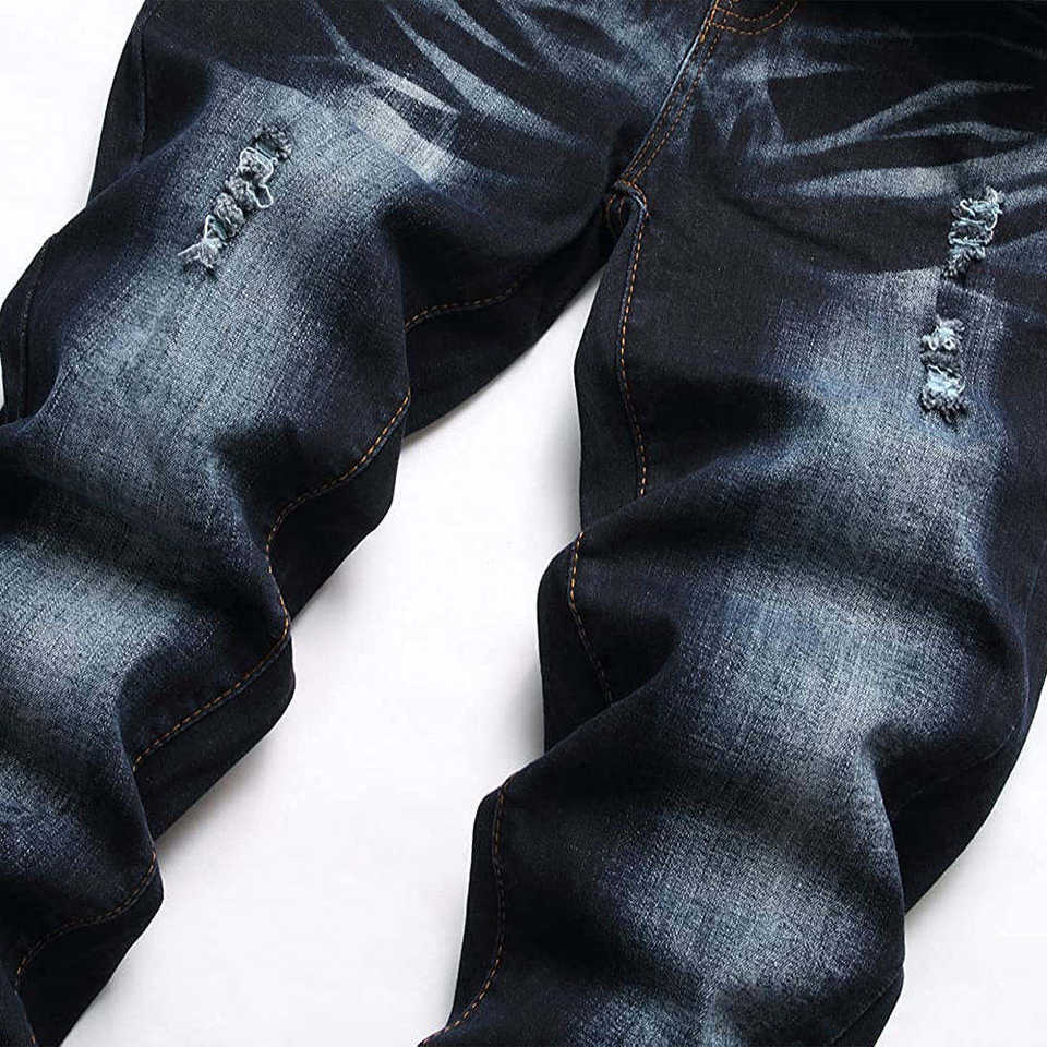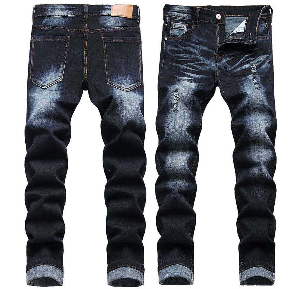 กางเกงยีนส์ผู้ชายทรงสลิมฟิตแบบใหม่จากโรงงาน ล้างสีแล้ว แต่งขาดๆ แบบดิสเทรส