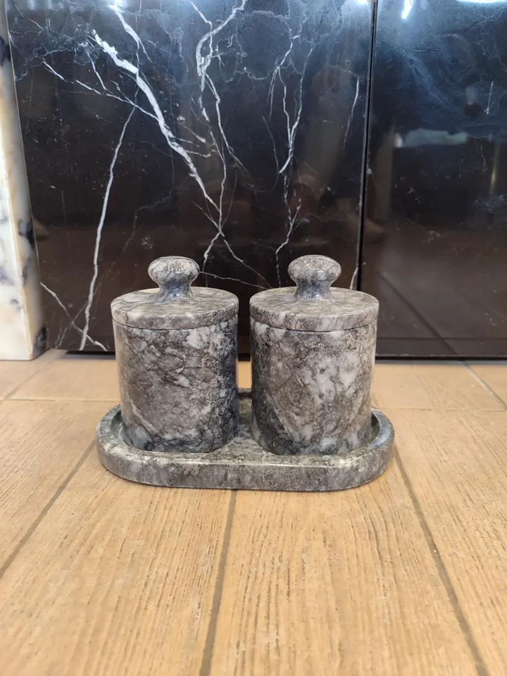 ชุดเครื่องปรุงรสหินอ่อนลายใหม่ โดดเด่นด้วยความงดงามเหนือกาลเวลา พร้อมลวดลายเม็ดหินที่สวยงาม เหมาะสำหรับบรรยากาศการรับประทานอาหารที่หรูหรา