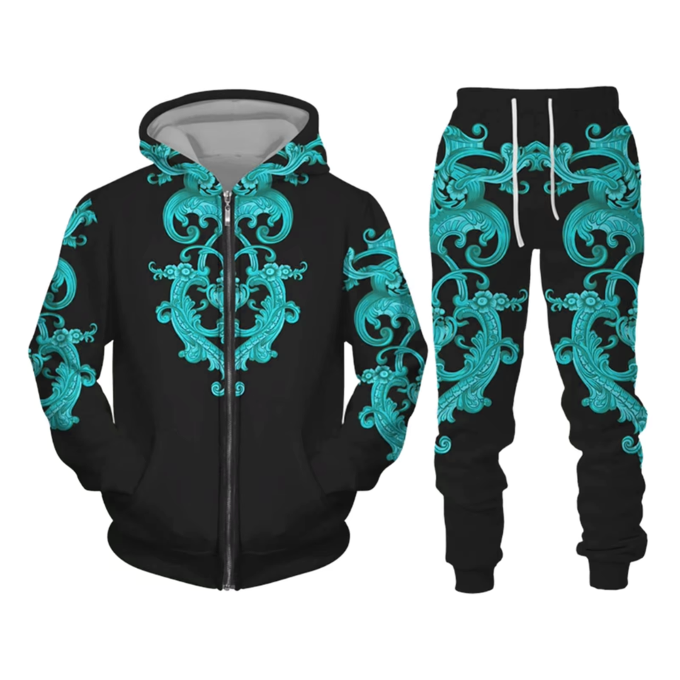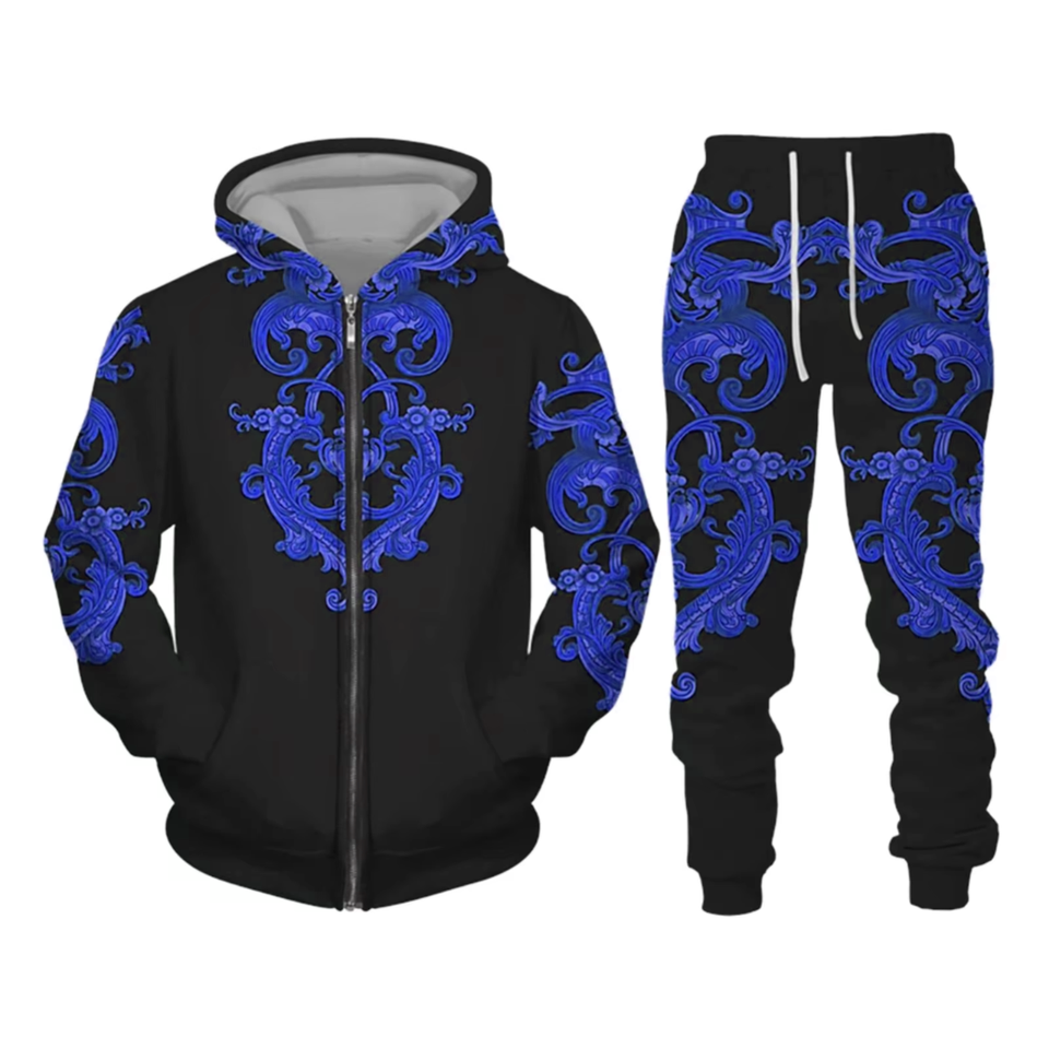 ชุดเซ็ตแทรคสูทผู้ชายแบบใหม่ล่าสุด พร้อมซิป ลายพิมพ์พัฟฟ์ กางเกงวอร์มขาบาน และเสื้อฮู้ดผ้าเทอร์รี่