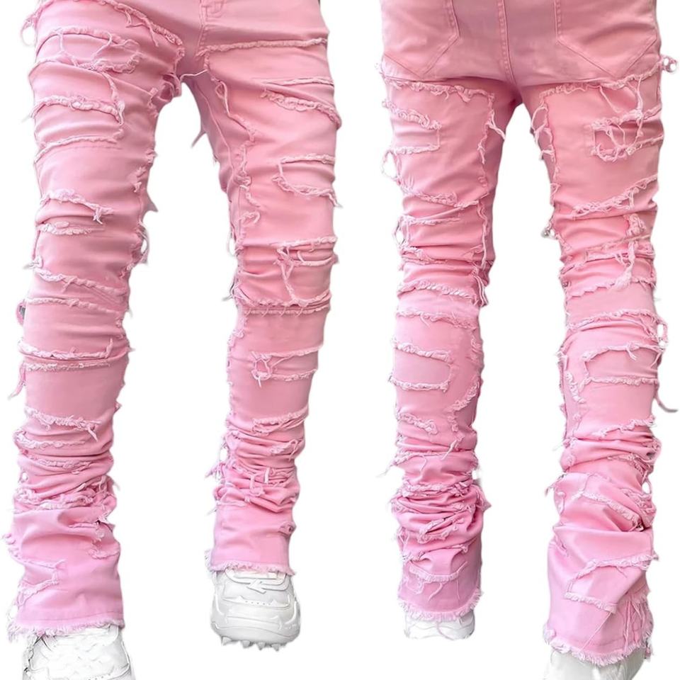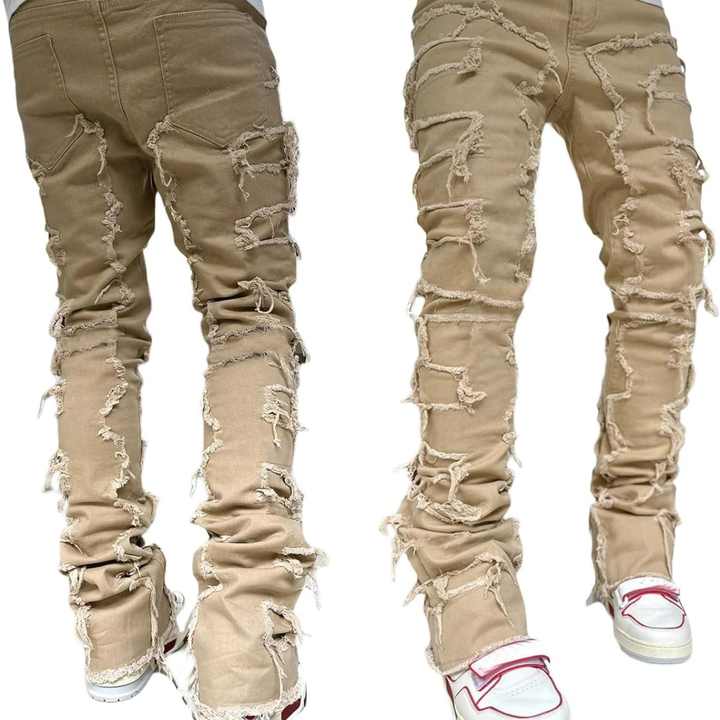 กางเกงยีนส์ผู้ชายสีดำแบบใหม่ ทรงสแตก ขาด แต่งลายปะ ขาดเซอร์ๆ สไตล์สตรีทแวร์ ฮิปฮอป