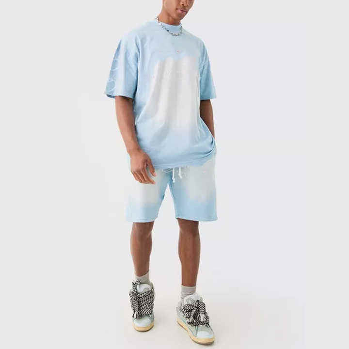 New Arrival Men's Casual Wear Twin Set 100% Cotton Sun Faded Shirt and Shorts 2 Piece Set Puff Printing Logo Twin Set