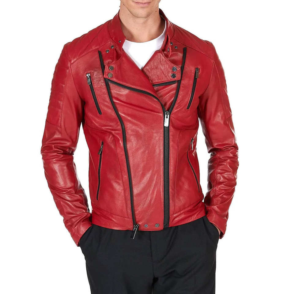 แจ็คเก็ตหนังวัวแท้สำหรับผู้ชายรุ่นใหม่ คุณภาพสูง สีแดงล้วน แขนยาว ปกคอพับ ซิปหน้า