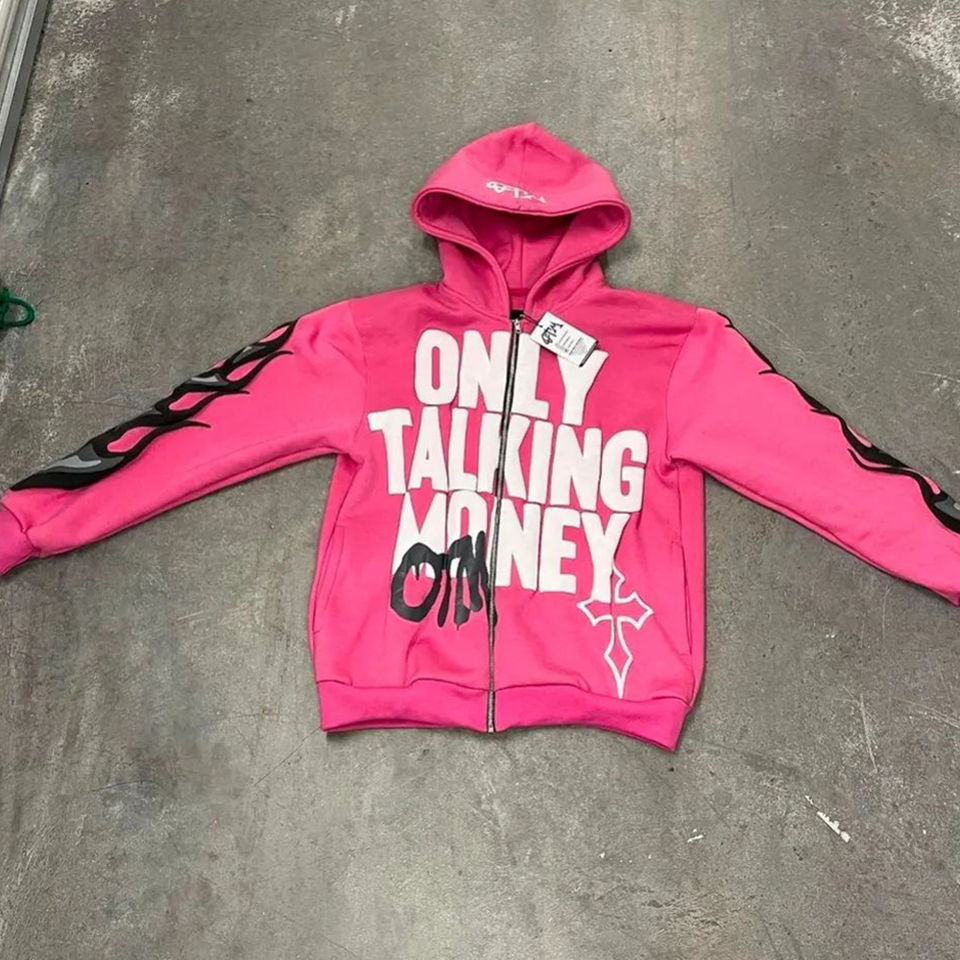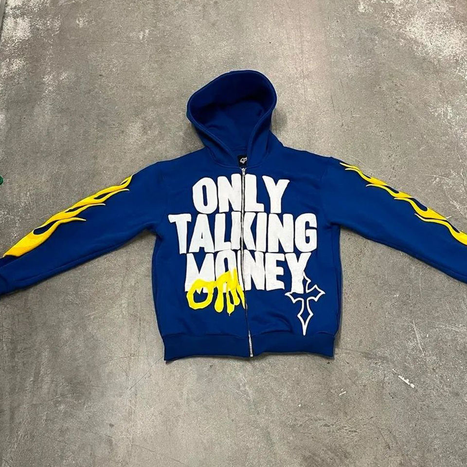 เสื้อมีฮู้ดผ้าเปลวไฟมีซิปลายพัฟ3D ออกแบบได้ตามต้องการสำหรับผู้ชายเสื้อมีฮู้ดผ้าเปลวไฟซีดจางมีฉลากแบบหลวมตามต้องการ