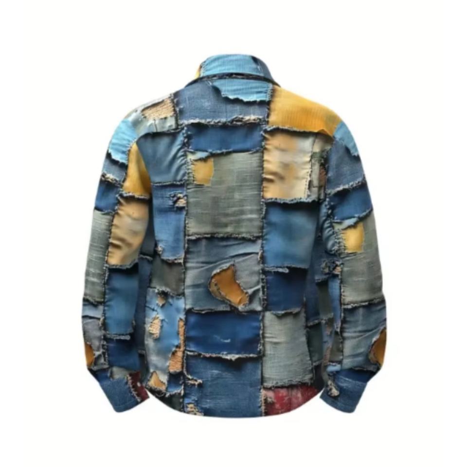 เสื้อเชิ้ตเดนิมผู้ชายแบบแพทช์เวิร์คมาใหม่ สไตล์สตรีทสุดเทรนดี้ ดีไซน์ทำเก่า เหมาะสำหรับโอกาสลำลองและสไตล์ฮิปฮอป