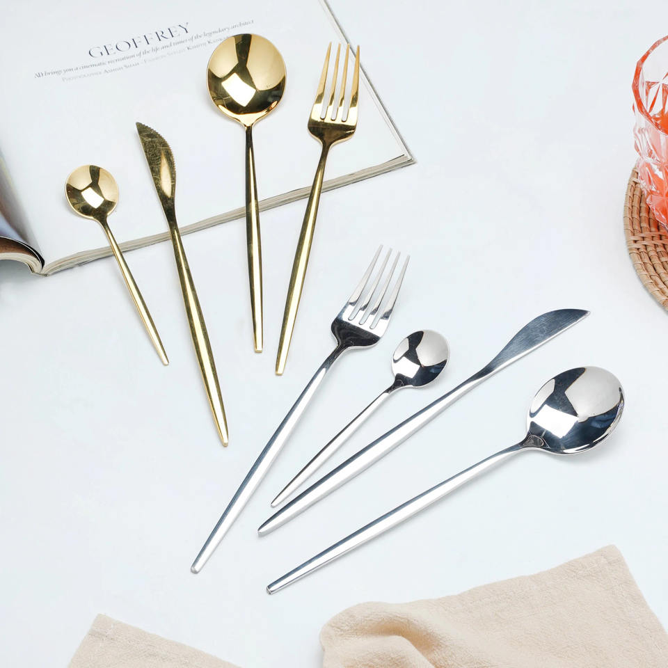 ชุดช้อนส้อมโลหะมาใหม่พร้อมด้ามยาวบางและชุบทองสำหรับโต๊ะอาหารชุดเครื่องใช้บนโต๊ะอาหาร