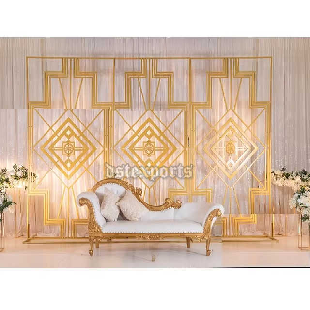 ขาตั้งโลหะแบบใหม่สำหรับตกแต่งเวทีต้อนรับงานแต่งงาน ซุ้มฉากหลังโลหะดีไซน์หรูหรา แผงตกแต่งงานแต่งงานสีทองสวยงาม สินค้านำเข้าจากสหรัฐอเมริกา