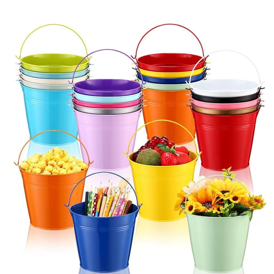 ถังเก็บและกระถางต้นไม้โลหะมาใหม่พร้อมห่วงจับสำหรับตกแต่งพื้นที่รับประทานอาหารที่บ้านถังสำเร็จรูปสีแดง