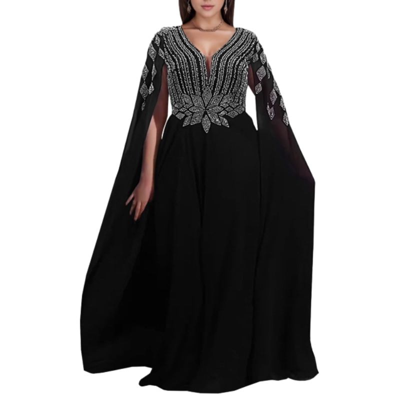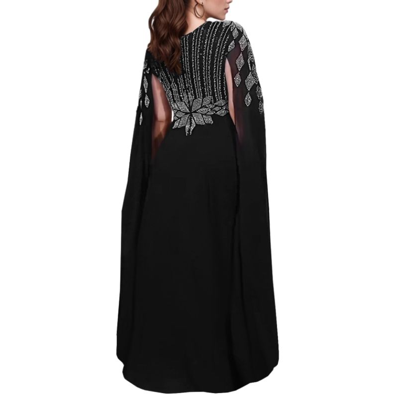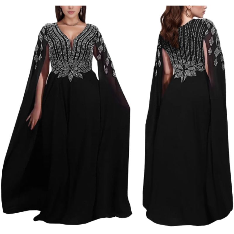 เดรสยาวผู้หญิงแบบใหม่สไตล์ตะวันออกกลาง ผ้าถักเนื้อแน่น แต่งคริสตัลวิบวับ ซีทรู คอวี แขนยาว ดีไซน์ธรรมชาติ