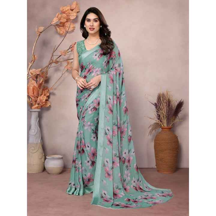 ส่าหรีมิ้นท์สดใสชุดเดรสงานปาร์ตี้ผ้าไหมพิมพ์ลายมอสพร้อมชุดราตรี