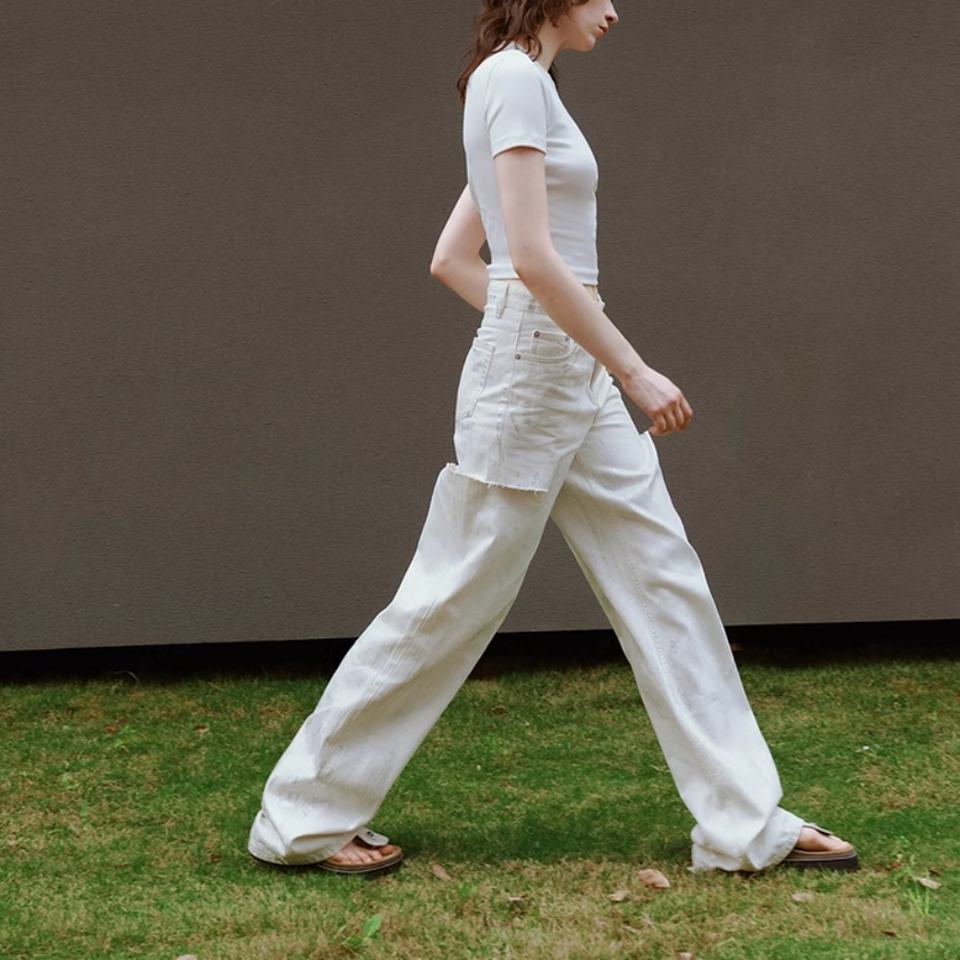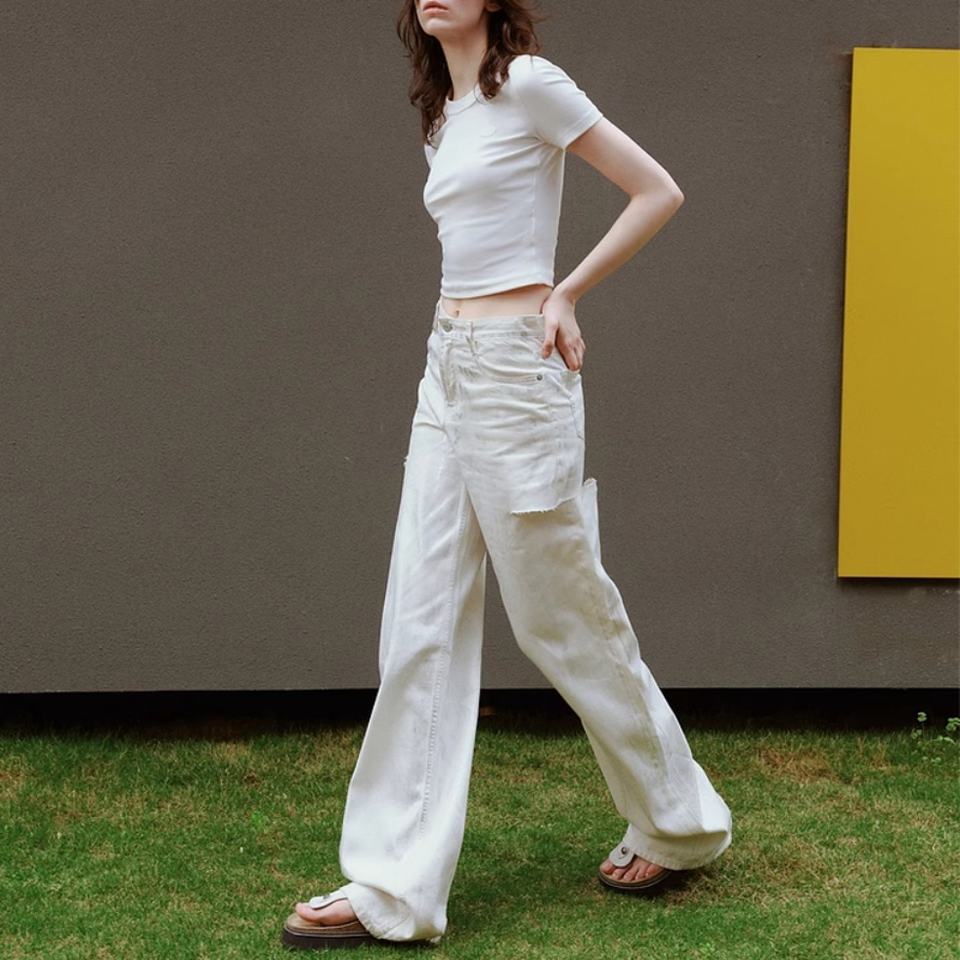 กางเกงยีนส์ขาบานเอวต่ำสีเงินลายจุดแบบใหม่ ระบายอากาศได้ดี ย้อมสีขาวแบบ Dirty Dyed ทรงตรง มีกระเป๋า ตกแต่งด้วยหมุด สำหรับฤดูใบไม้ผลิ