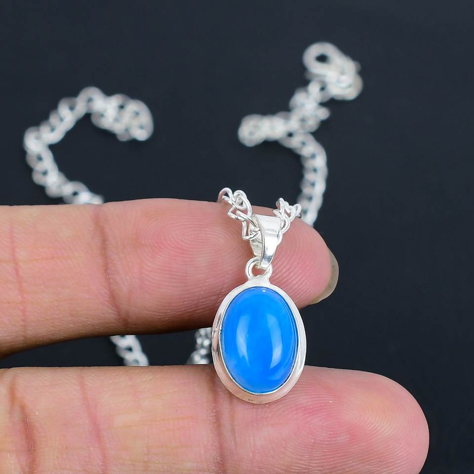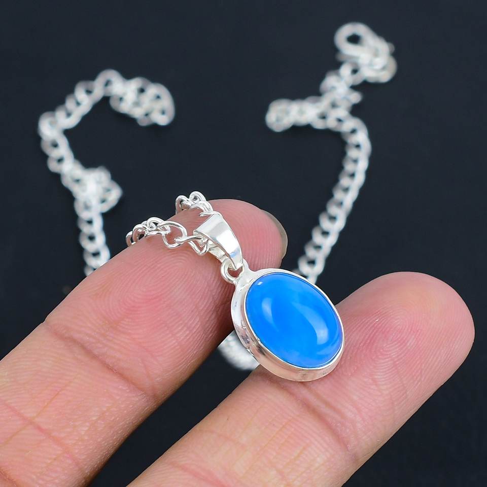 สร้อยคอจี้หินแคลเซโดนีสีน้ำเงินธรรมชาติแบบใหม่ ทำจากเงินแท้ 925 รูปทรงวงรี 8x10 มม. งานแฮนด์เมด เรียบหรู สไตล์มินิมอล