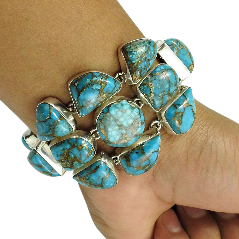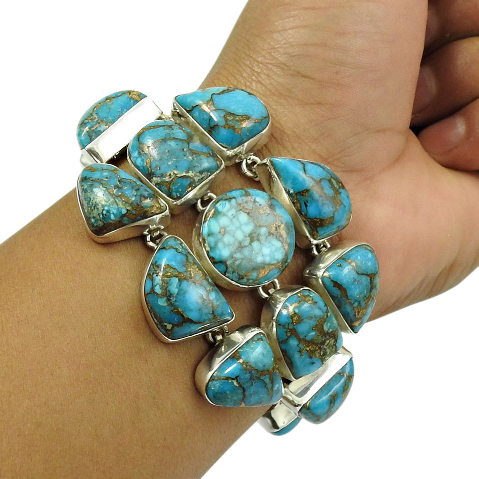 กำไลข้อมือพลอยสีเทอร์ควอยส์สีฟ้าทองแดงธรรมชาติมาใหม่ดีไซน์เป็นเอกลักษณ์925อัญมณีเงินสเตอร์ลิงทำด้วยมือเครื่องประดับโบฮีเมียนอินเดีย