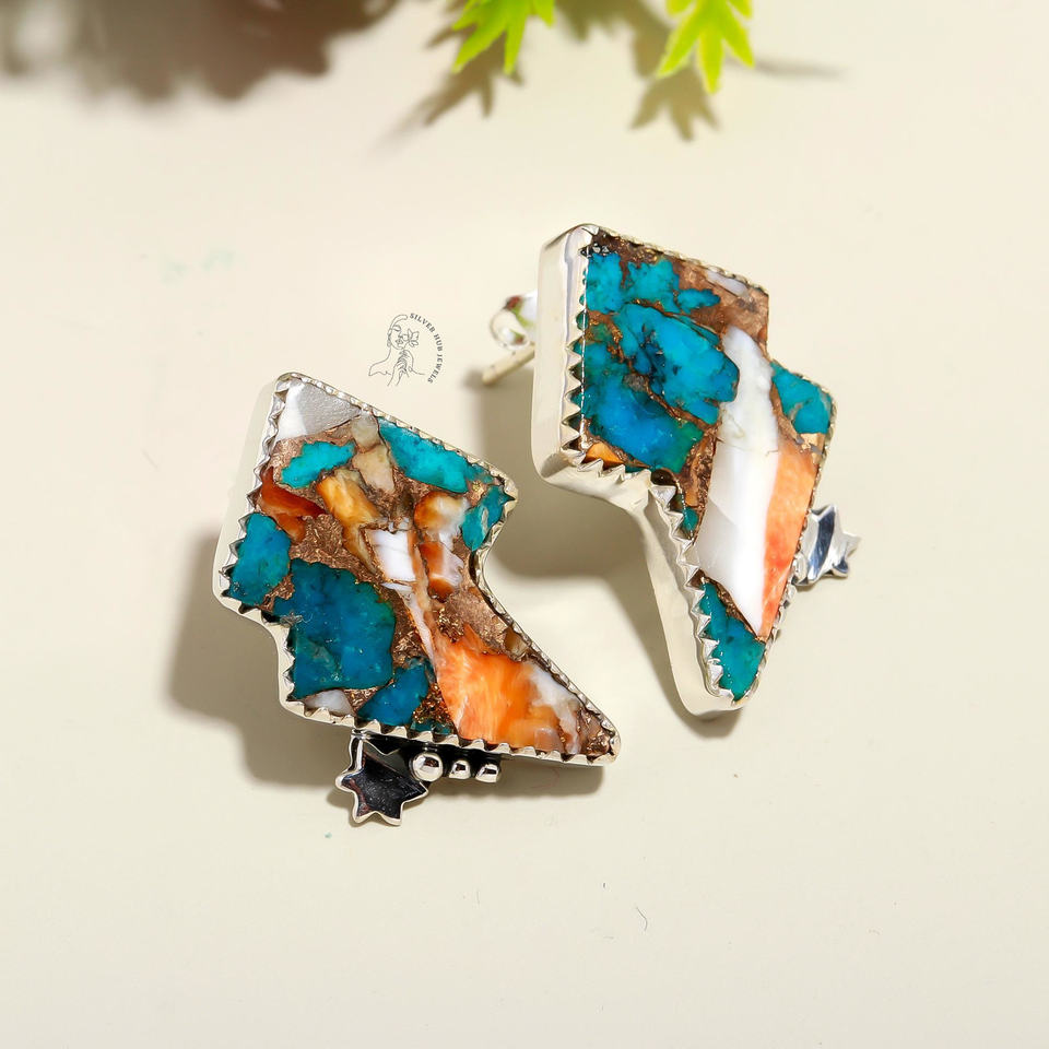 ต่างหูหมุดทองแดงเคลือบเทอร์ควอยซ์ทรงแฟนซีทำจากเงินเรียบธรรมชาติมาใหม่
