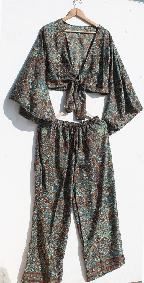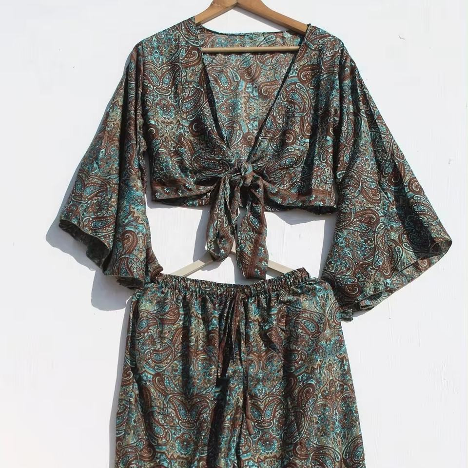 มาใหม่สไตล์ใหม่พิมพ์ลายดอกไม้ส่าหรีผ้าไหมพืชยอดนิยมกับกางเกง Palazzo อินเดียทําด้วยมือปมผ้าไหมด้านบนกับกางเกงสําหรับผู้หญิง