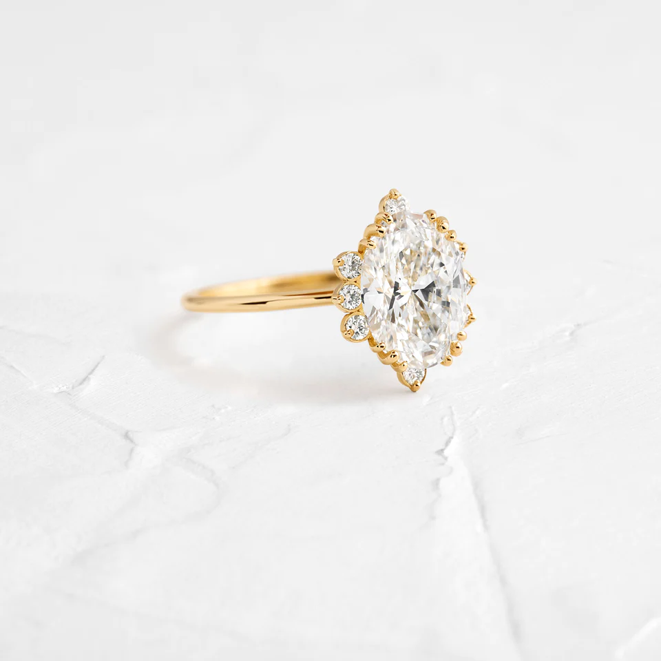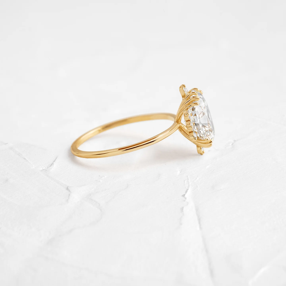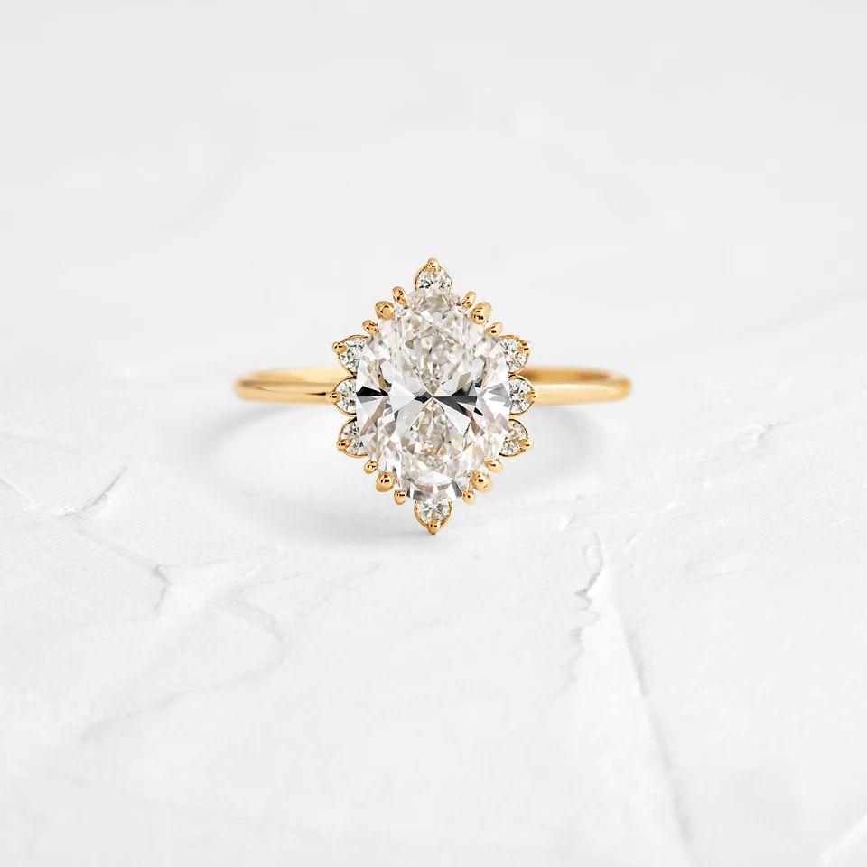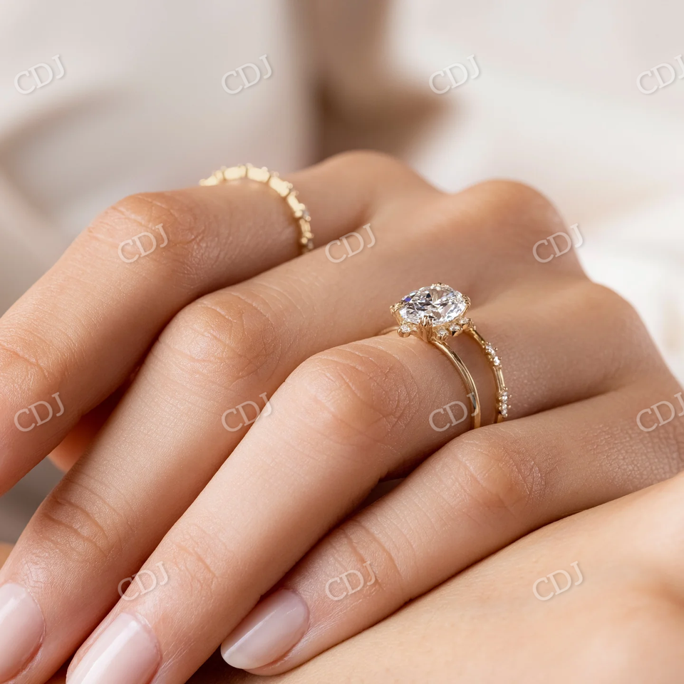 แหวนเพชรโมอิสสีทรงรีตัดมาใหม่พร้อมแหวนแต่งงานฮาโลแบบโบราณแหวนเพชรแบบสั่งทำ