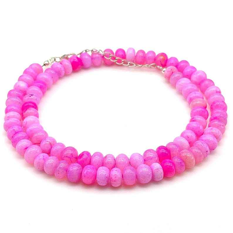 สินค้ามาใหม่สีชมพูโอปอลลูกปัดอัญมณีสร้อยคอลูกปัดกลมเรียบขนาด7-8มม. เครื่องประดับแฟชั่น