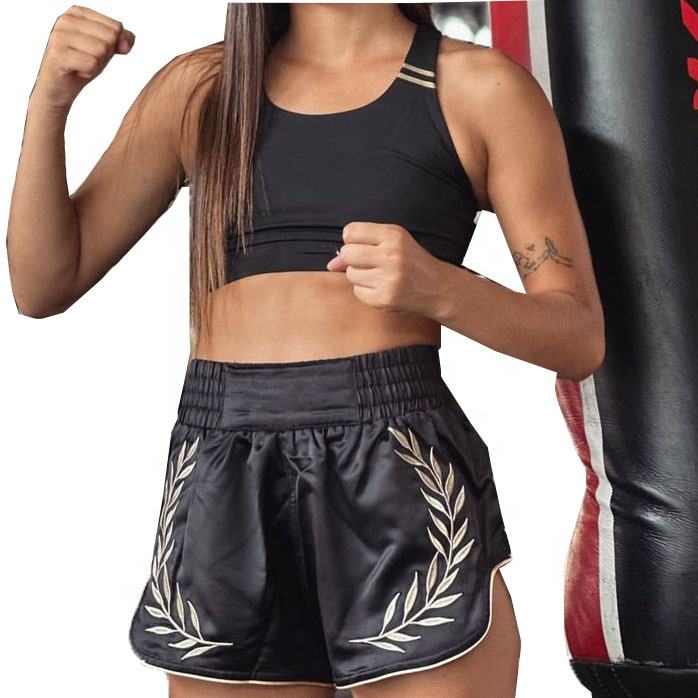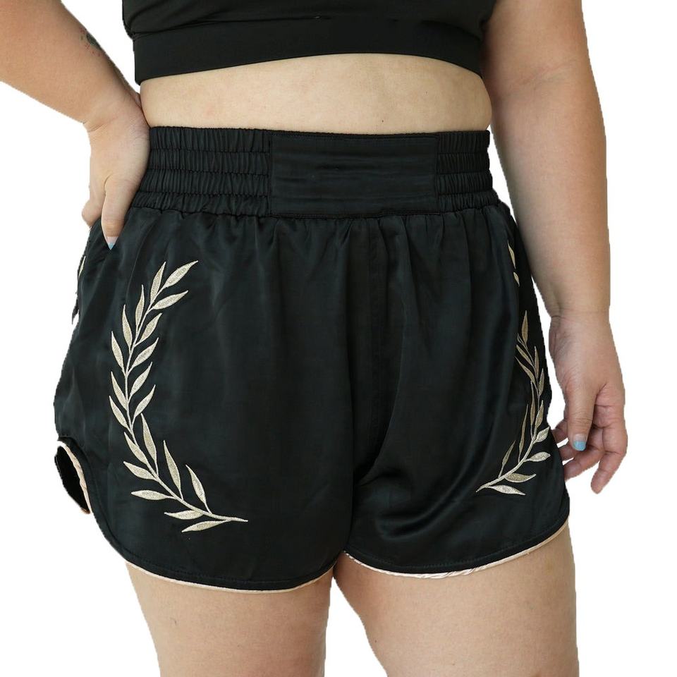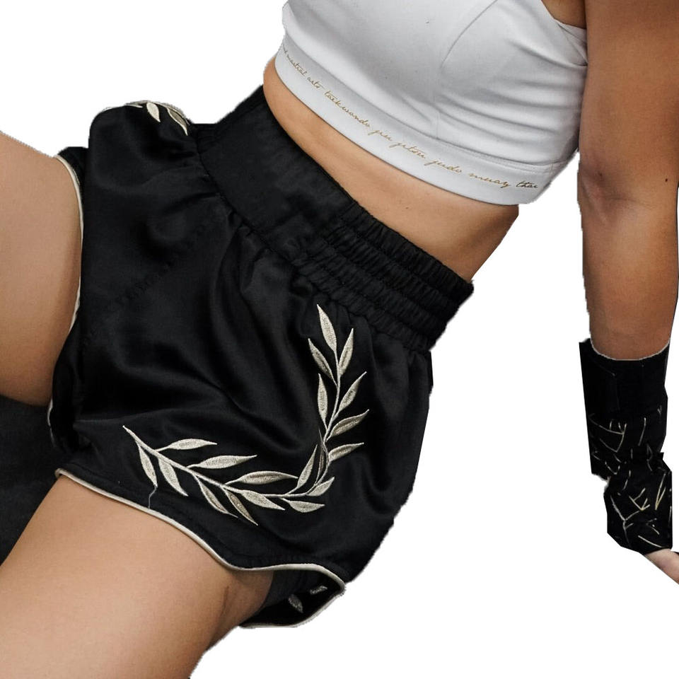 กางเกงมวยไทยผู้หญิงสีดำ-ทอง คุณภาพพรีเมียม รุ่นใหม่ล่าสุด แบบมืออาชีพสำหรับผู้ใหญ่ รับสั่งทำพิเศษ
