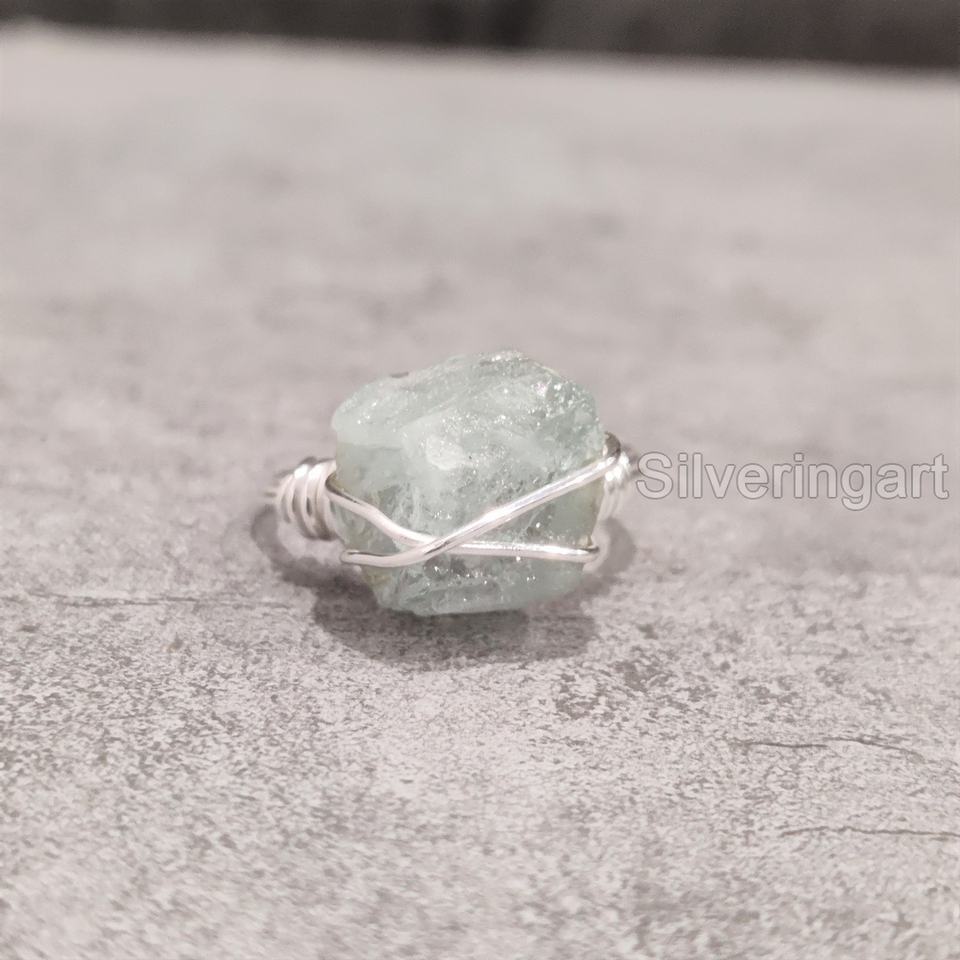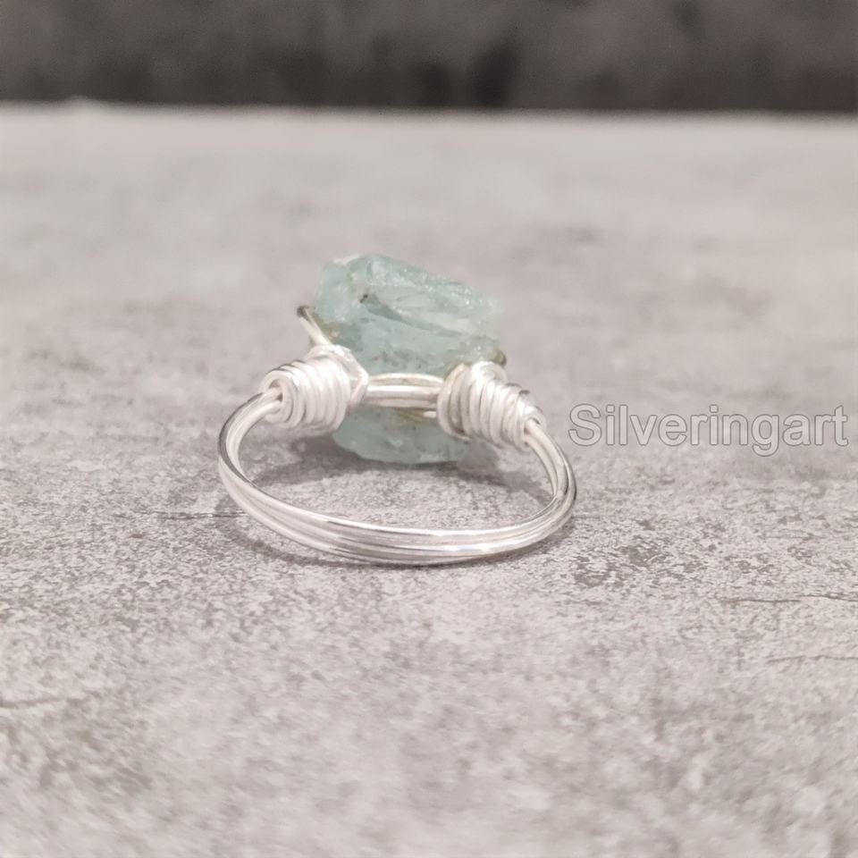 เครื่องประดับหินหยาบมาใหม่แหวนผู้หญิงพลอยพลอยสีฟ้าธรรมชาติพลอยเดือนมีนาคมสายลวดสำหรับ925แหวนเงินสเตอร์ลิง