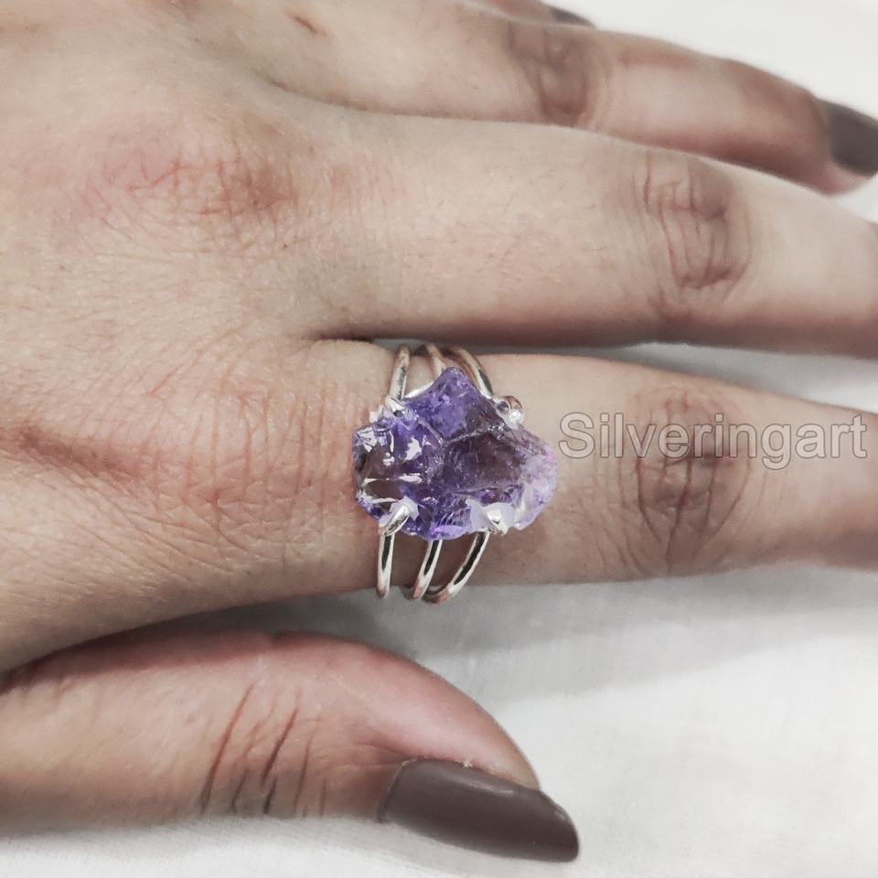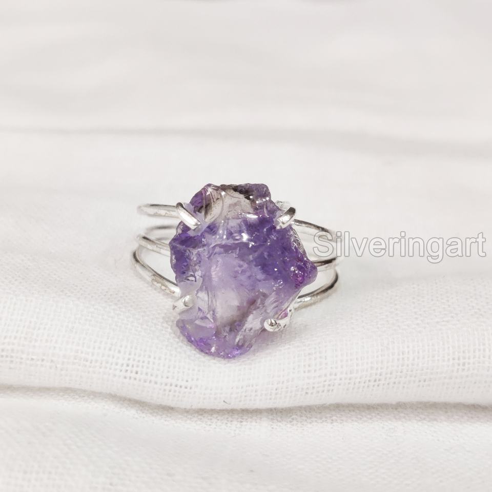 เครื่องประดับหินหยาบมาใหม่แหวนสตรีพลอยอเมทิสต์ธรรมชาติพลอยเทียมพลอยเทียมสำหรับผู้หญิง3สายแบบเรียบ925แหวนเงินสเตอร์ลิง