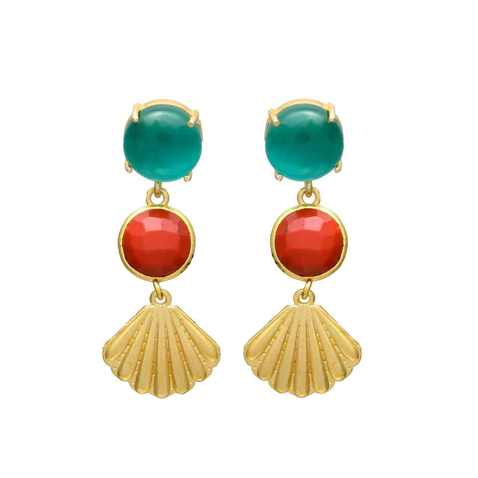 ต่างหูระย้าประดับเปลือกหอยและอัญมณีสีทองประดับพลอยสีส้มและน้ำเงิน
