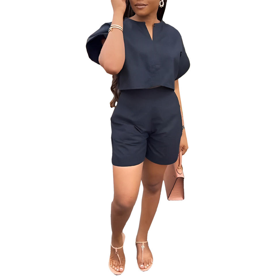 ชุดเซ็ตสองชิ้นสีพื้นแขนสั้นทรงหลวมแฟชั่นสำหรับผู้หญิงมาใหม่สำหรับฤดูร้อน