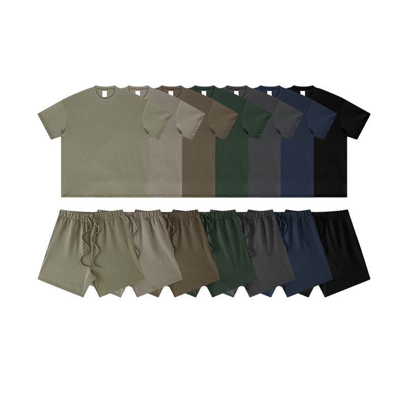ชุดเซ็ตเสื้อผ้ากีฬาลำลองแบบใหม่ เสื้อโอเวอร์ไซส์สีพื้น กางเกงขาสั้น 2 ชิ้น ชุดเซ็ตผู้ชาย รับสกรีนโลโก้ ผ้าฝ้าย