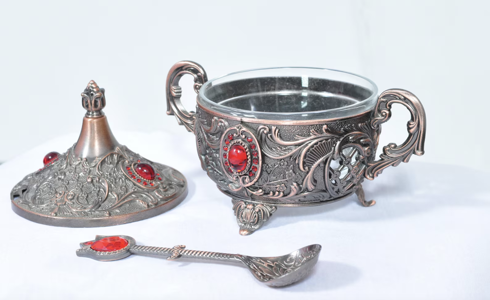 เครื่องปั่นน้ำตาลหม้อสแตนเลสสินค้ามาใหม่อุปกรณ์ตกแต่งโต๊ะทองแดงขึ้นรูปด้วยมือเครื่องครัวเงินวัสดุโลหะ