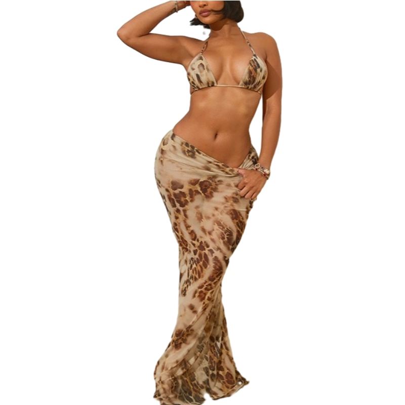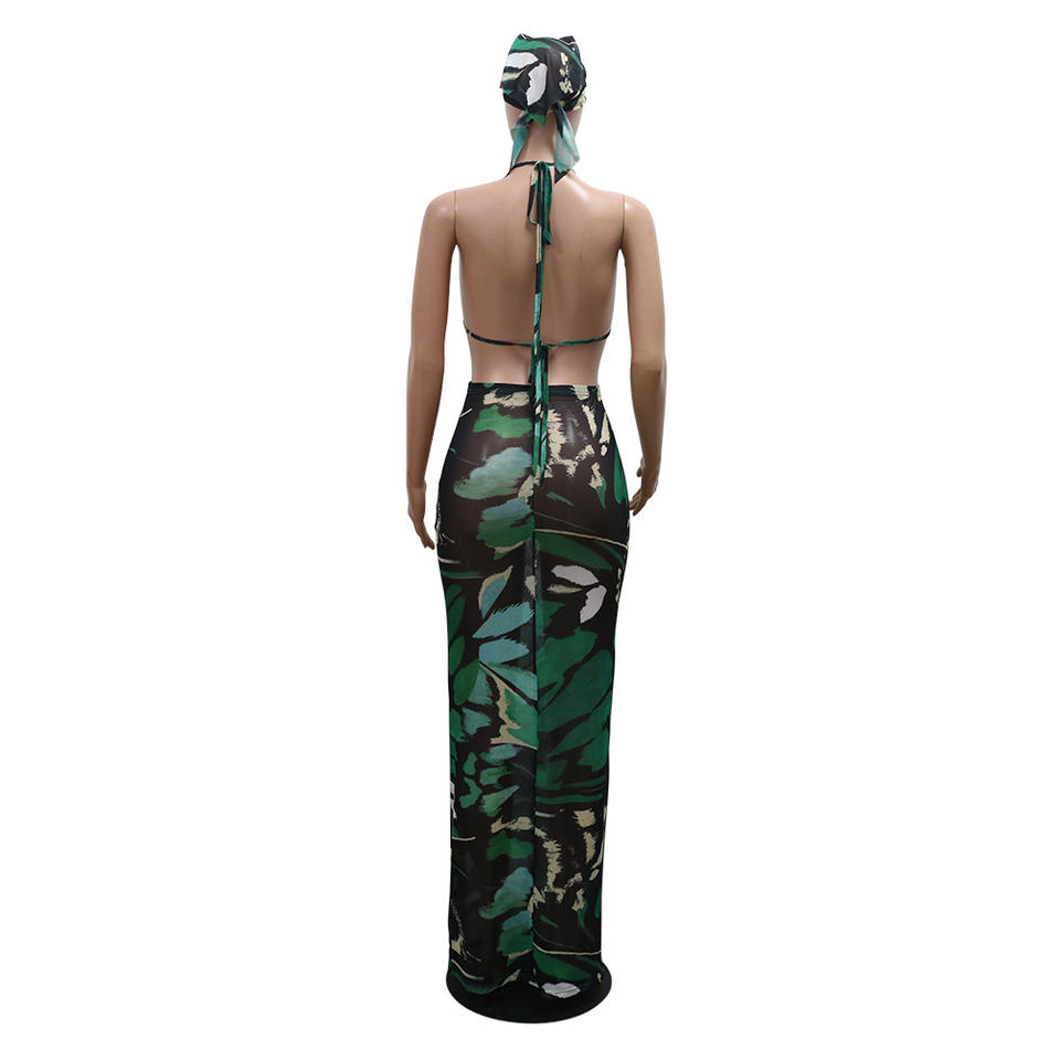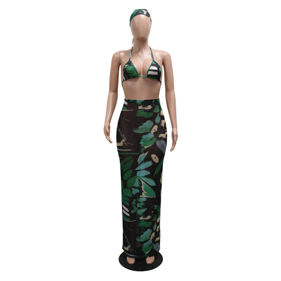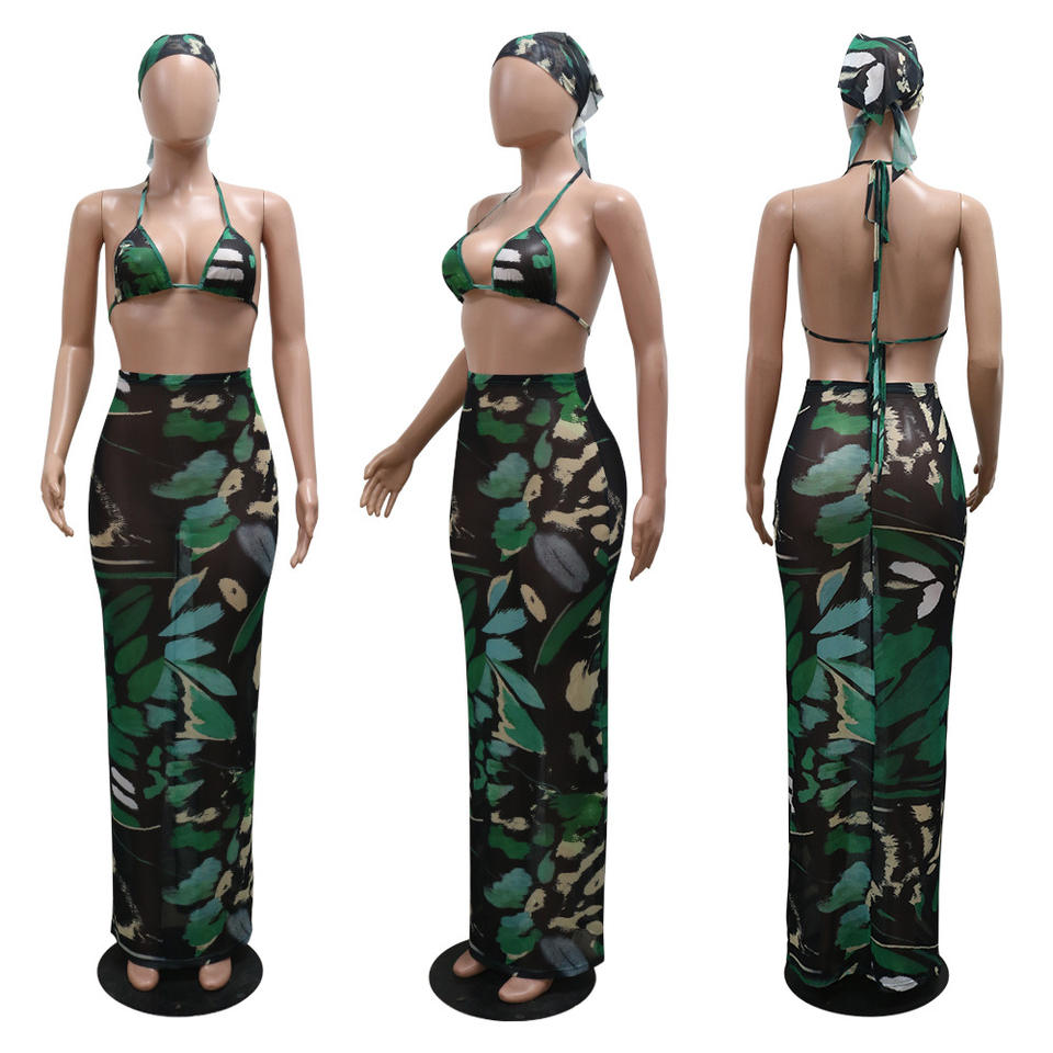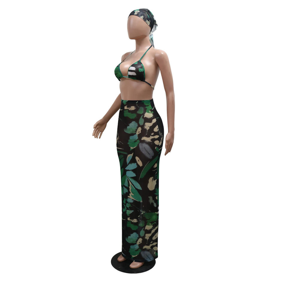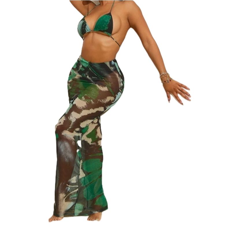 ลักษณะ:ป้องกัน Pilling, เป็นมิตรกับสิ่งแวดล้อม, ป้องกันไฟฟ้าสถิต, Printed Sexy Bikini with Maxi Dress Two-Piece Set