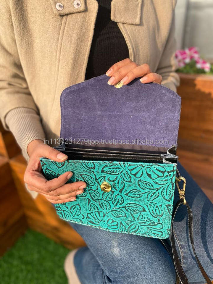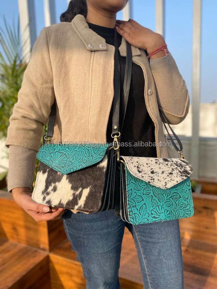 กระเป๋าสะพายหนังวัวขนเฟอร์ลายนูนสีเทอร์ควอยส์มีสไตล์ใหม่สะพายไหล่หนังแท้แฟชั่นสไตล์ตะวันตก
