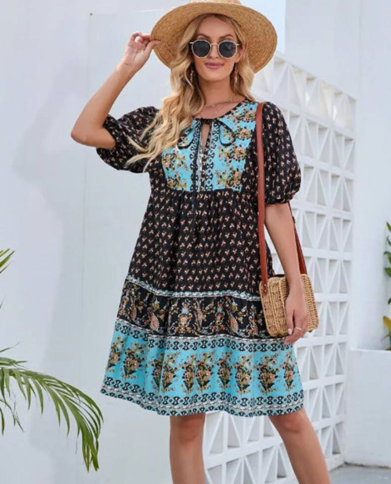 มินิเดรสลำลองสไตล์โบฮีเมียนสำหรับผู้หญิงมาใหม่ฤดูร้อนพิมพ์ลายดอกไม้แขนยาวคลุมเข่าแบบซักได้