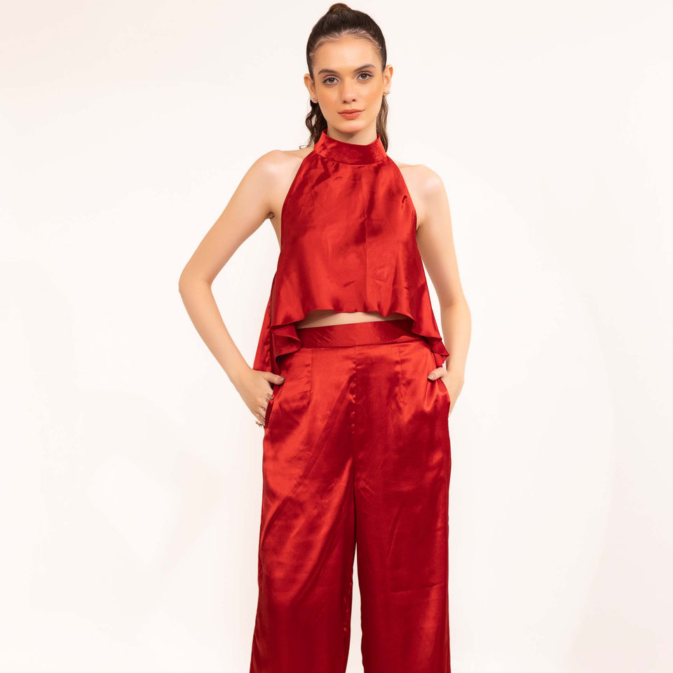 ชุดเสื้อคล้องคอเปิดหลังสีแดงสุดฮอตพร้อมกางเกงประสานงาน