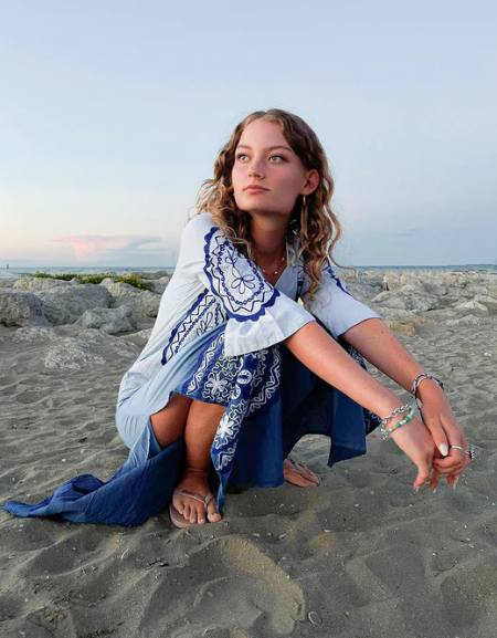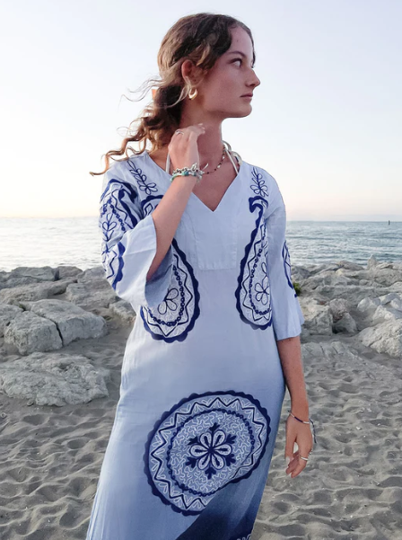 เดรสยาวลายมัดย้อมสำหรับฤดูร้อนแบบใหม่สำหรับผู้หญิง คอวี ปักลาย แขนสามส่วน เหมาะสำหรับใส่ไปเที่ยวชายหาดหรือรีสอร์ท