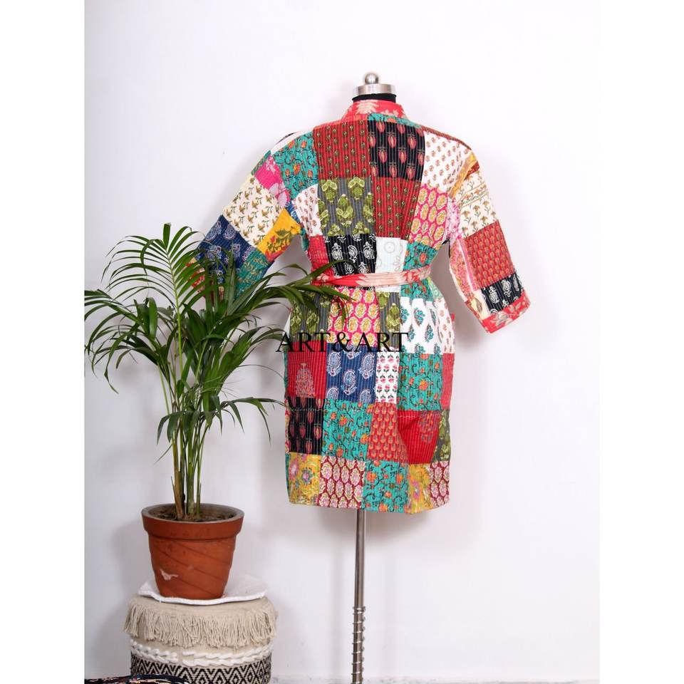 ชุดคลุมกิโมโนผ้าไหมวินเทจลายปะติดปะต่อแบบคันธา รุ่นใหม่ล่าสุดสำหรับฤดูร้อน พร้อมเข็มขัดผูกเอว ระบายอากาศได้ดี ความยาวระดับเข่า เหมาะสำหรับใส่นอนสำหรับผู้หญิง