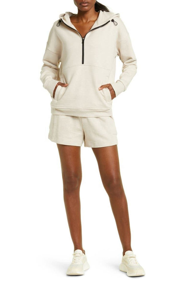 ชุดกางเกงขาสั้นมีฮู้ดสำหรับผู้หญิงชุดกางเกงขาสั้นแบบลำลองสองชิ้นเหนือเข่าแห้งเร็วระบายอากาศได้ดีดีไซน์ตามสั่งใหม่ล่าสุด