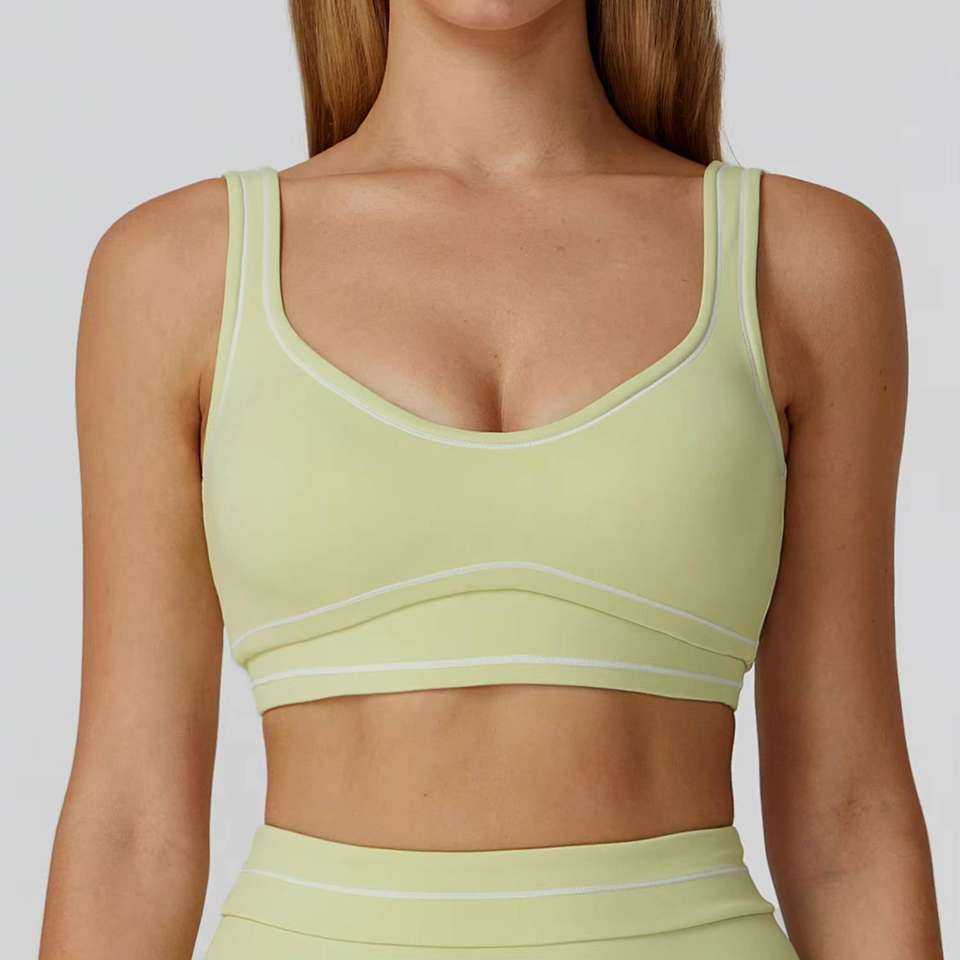 สปอร์ตบราด้านหลังเป็นรูปตัวยูสำหรับผู้หญิงมาใหม่สปอร์ตบราออกกำลังกายด้านหลังสีบล็อกดีไซน์เสื้อโยคะแห้งเร็ว