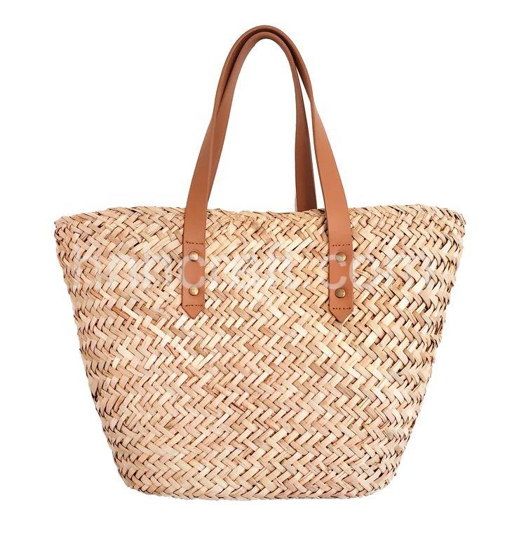 กระเป๋าถือหญ้าทะเล,กระเป๋าโท้ทหญ้าทะเลพร้อมหูจับ OEM กระเป๋าถือชายหาดใบปาล์มทอมือโลโก้บรรจุภัณฑ์แบบกำหนดเอง
