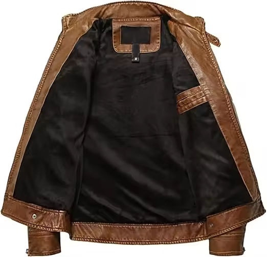 แจ็คเก็ตหนังมอเตอร์ไซค์ทรงสลิมฟิตสีน้ำตาลวินเทจสำหรับผู้ชายรุ่นใหม่ | เสื้อแจ็คเก็ตหนังวัวคุณภาพพรีเมียมขายส่ง