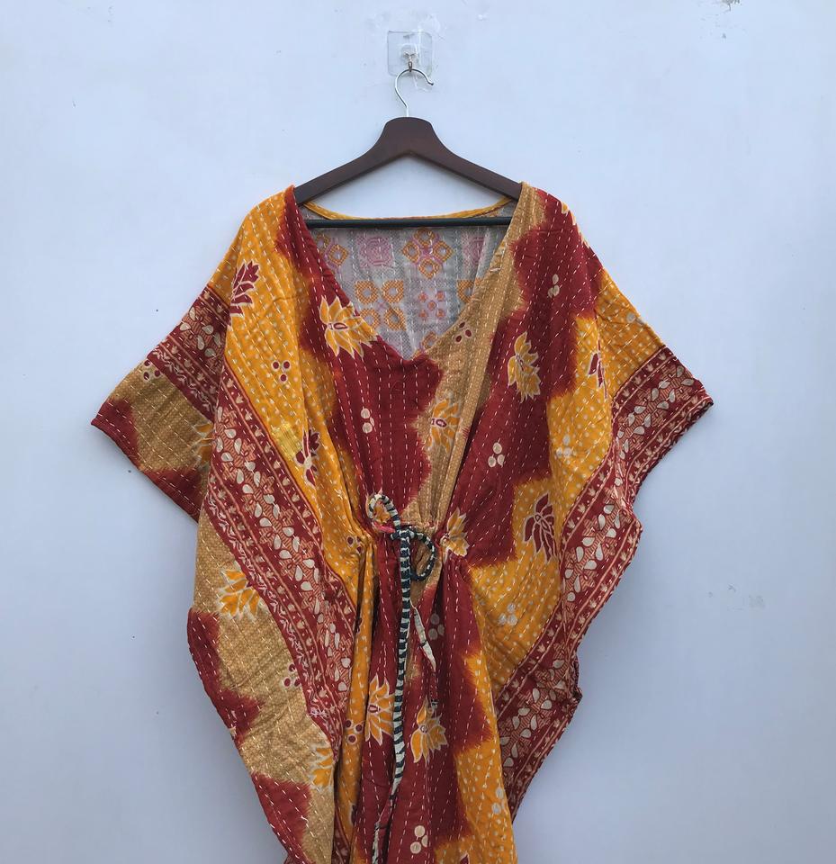 ชุดคลุมอาบน้ำสไตล์วินเทจ Kantha สำหรับผู้หญิง ผ้าฝ้ายคอวี ปิดด้วยเชือกผูก ระบายอากาศได้ดี เหมาะสำหรับใส่ไปชายหาดในฤดูร้อน