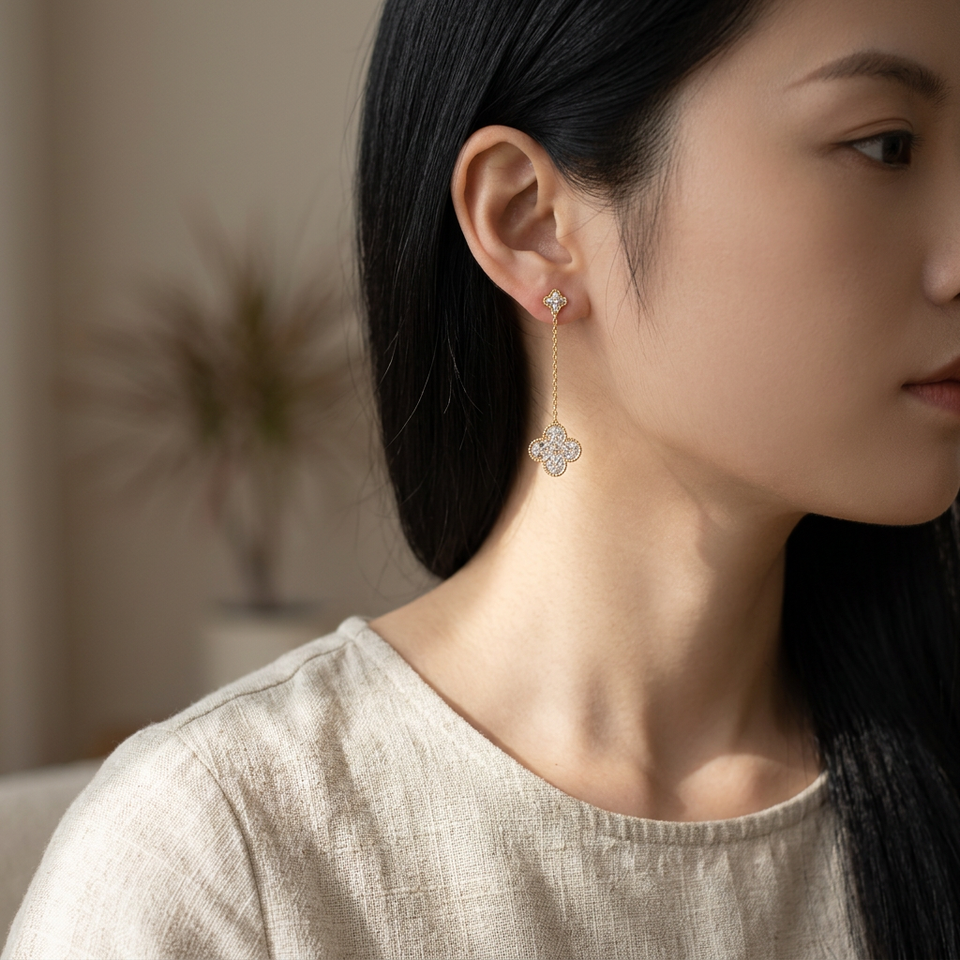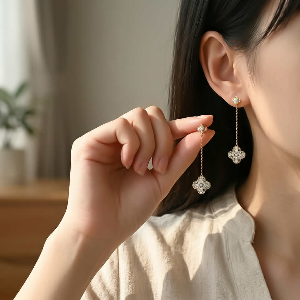 ต่างหูเพชรแท้ทรงใบโคลเวอร์สี่แฉกและกางเขน ดีไซน์วินเทจ ทองคำแท้ 18K สำหรับผู้หญิง รุ่นใหม่ล่าสุด