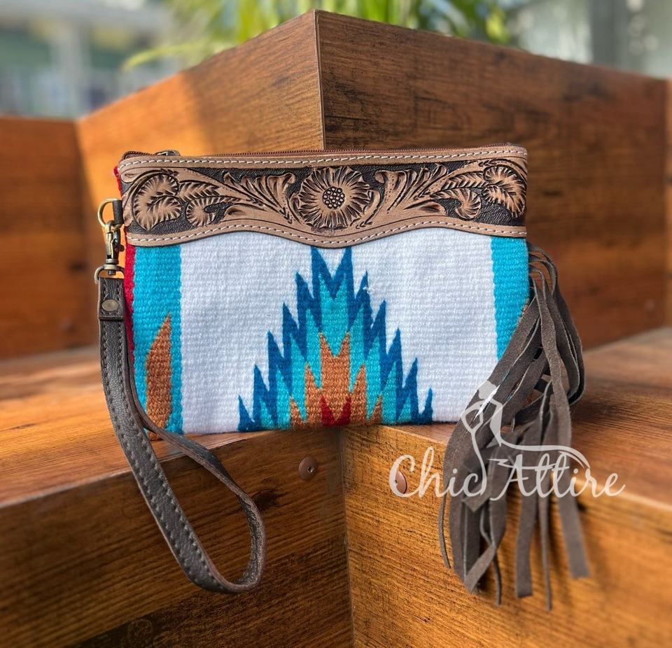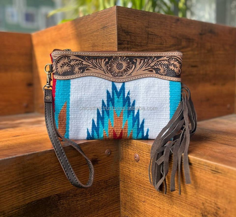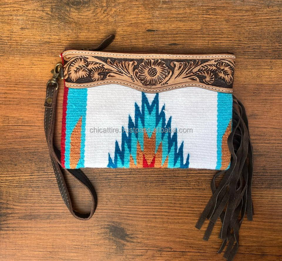 Product name:Stylish Aztec Tooled Leather Tassel Clutch