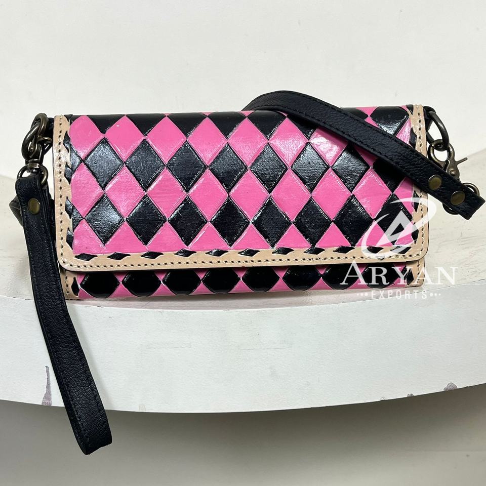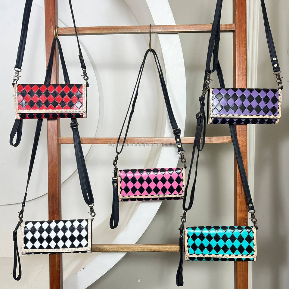 Product name:Hand Tooled Checkered Leather Crossbody Clutch Bag