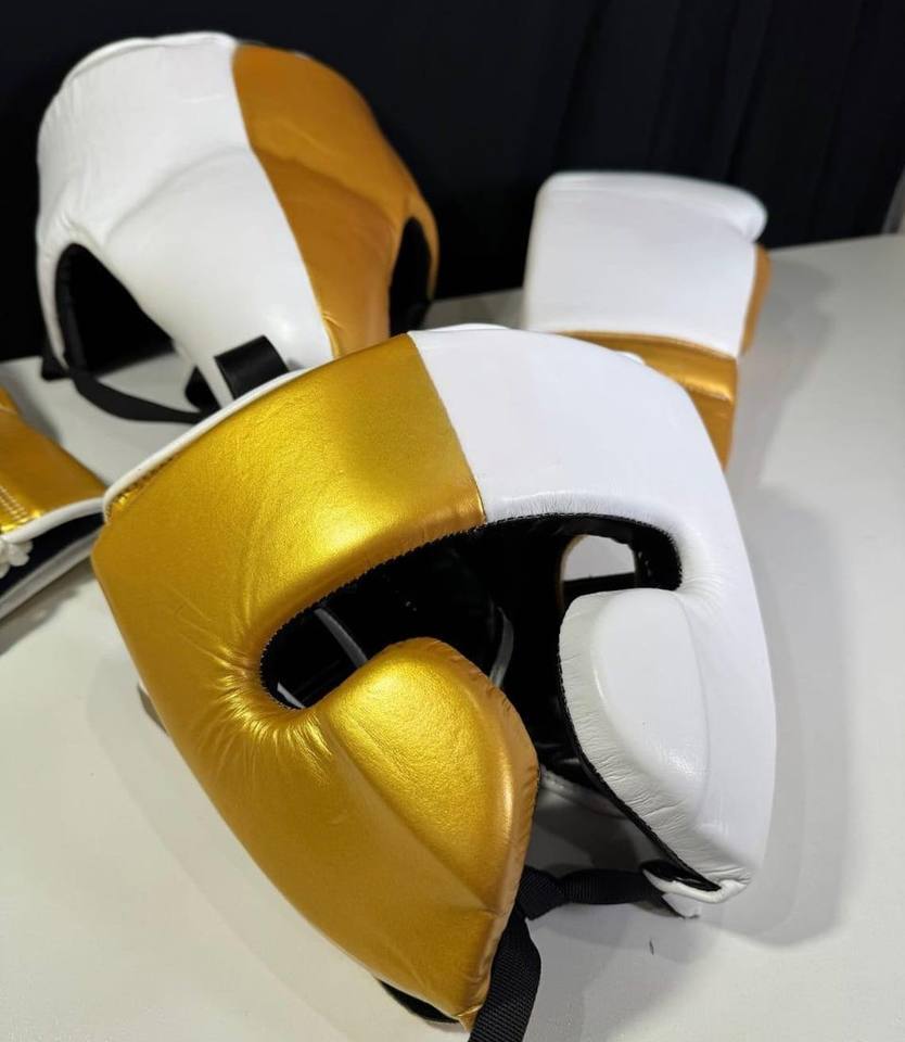 สินค้ามาใหม่ ขายส่ง ชุดชกมวยหนังแท้สีขาวและสีทองคุณภาพสูง พร้อมโลโก้สั่งทำ ชุดฝึกซ้อมชกมวย ชุดอุปกรณ์ต่อสู้ CP-BHG-02