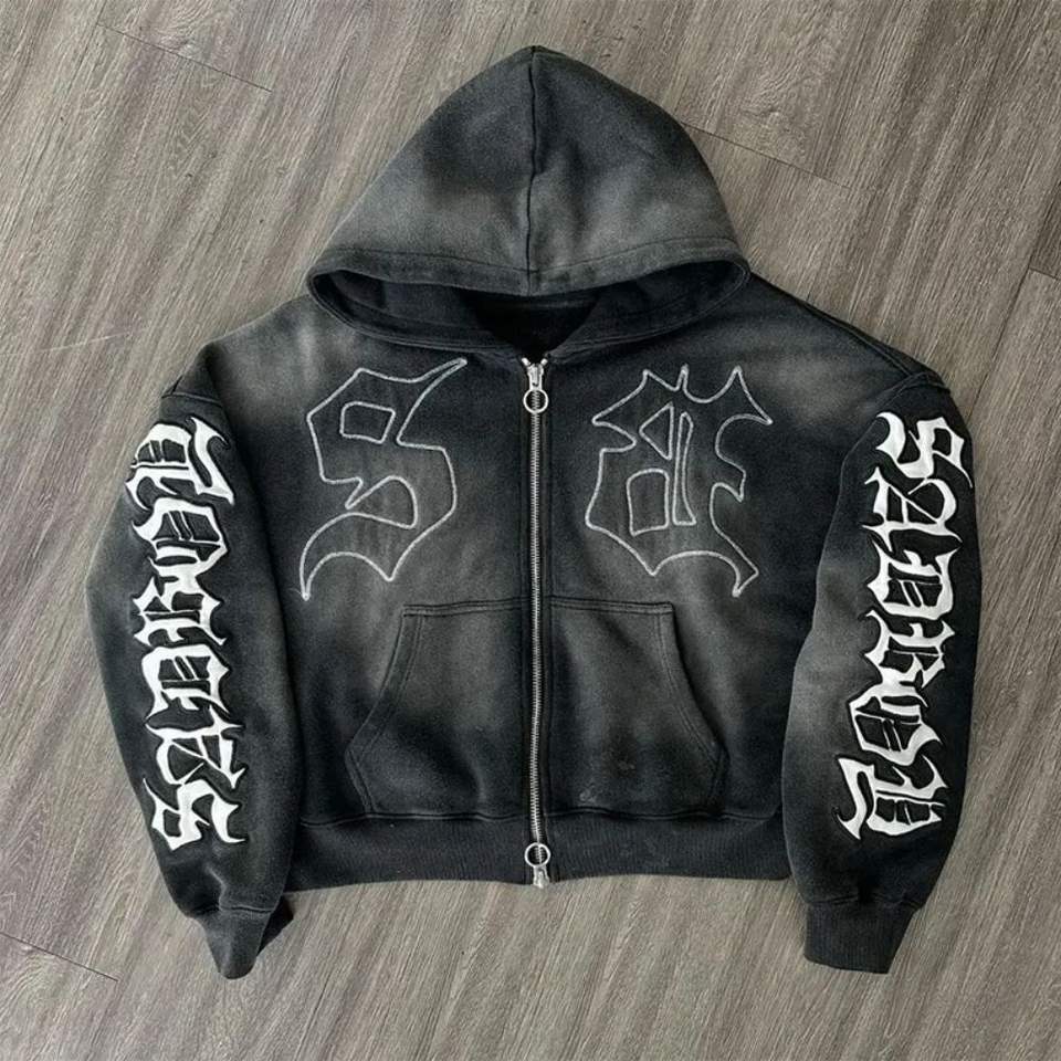 เสื้อฮู้ดสำหรับผู้ชายผ้าวินเทจแอซิดกรดซีดแดดแบบไม่มีสายโลโก้ตามสั่ง