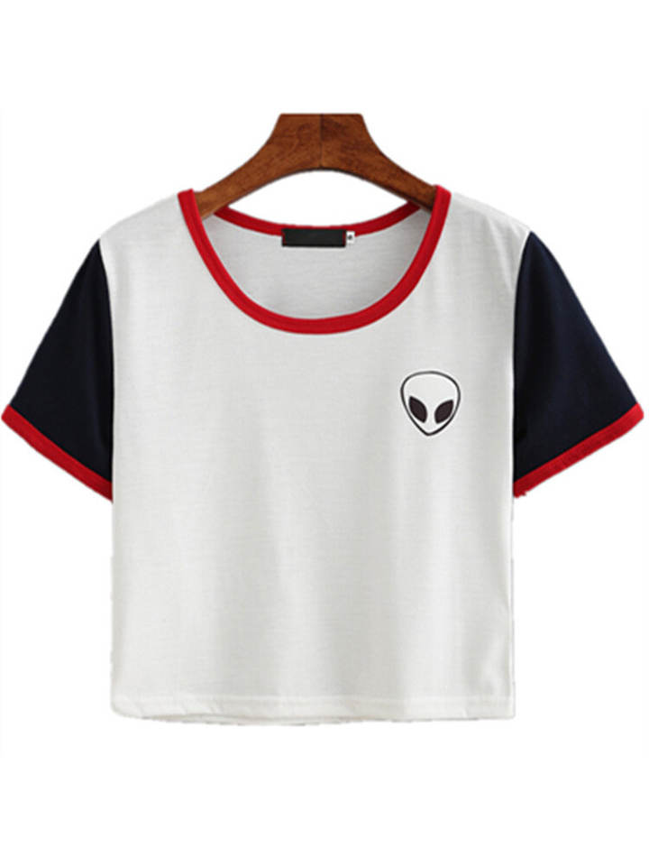 เสื้อครอปแขนสั้นสำหรับผู้หญิง,ผ้าฝ้ายคอตตอนสีล้วนป้องกันการกัดคอเสื้อ
