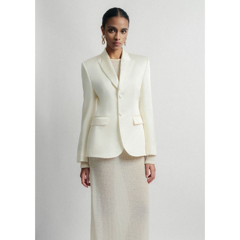 เสื้อเบลเซอร์ผ้าซาตินผ้าไหมผ้าซาตินสีขาวเป็นมิตรต่อสิ่งแวดล้อมสำหรับผู้หญิงมาใหม่ฉลากส่วนตัว