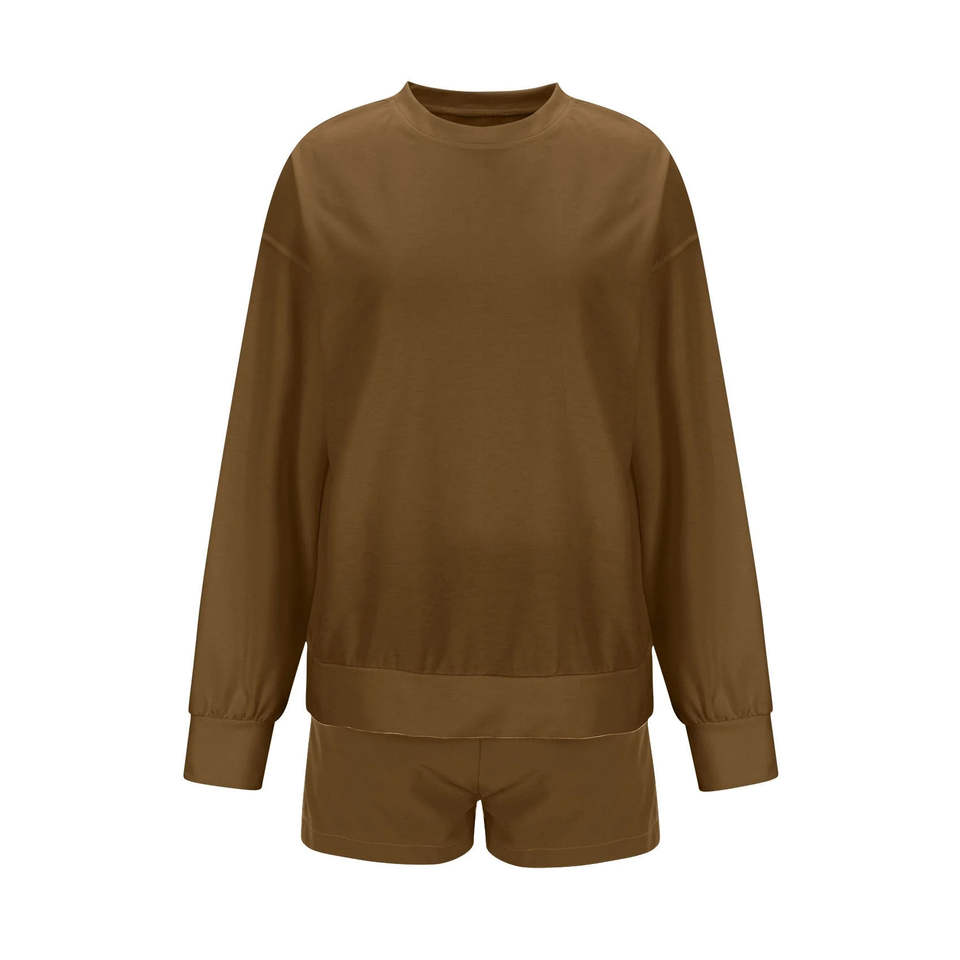 ชุดเซ็ตเสื้อสเวตเชิ้ตคอกลมสีพื้นพร้อมกางเกงขาสั้นสำหรับผู้หญิง ดีไซน์ใหม่ รับสกรีนโลโก้ สไตล์ลำลอง 2 ชิ้น เหมาะสำหรับลุคสตรีทแฟชั่น