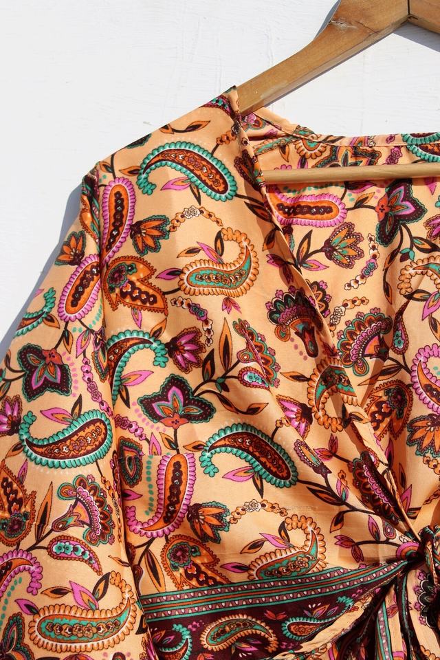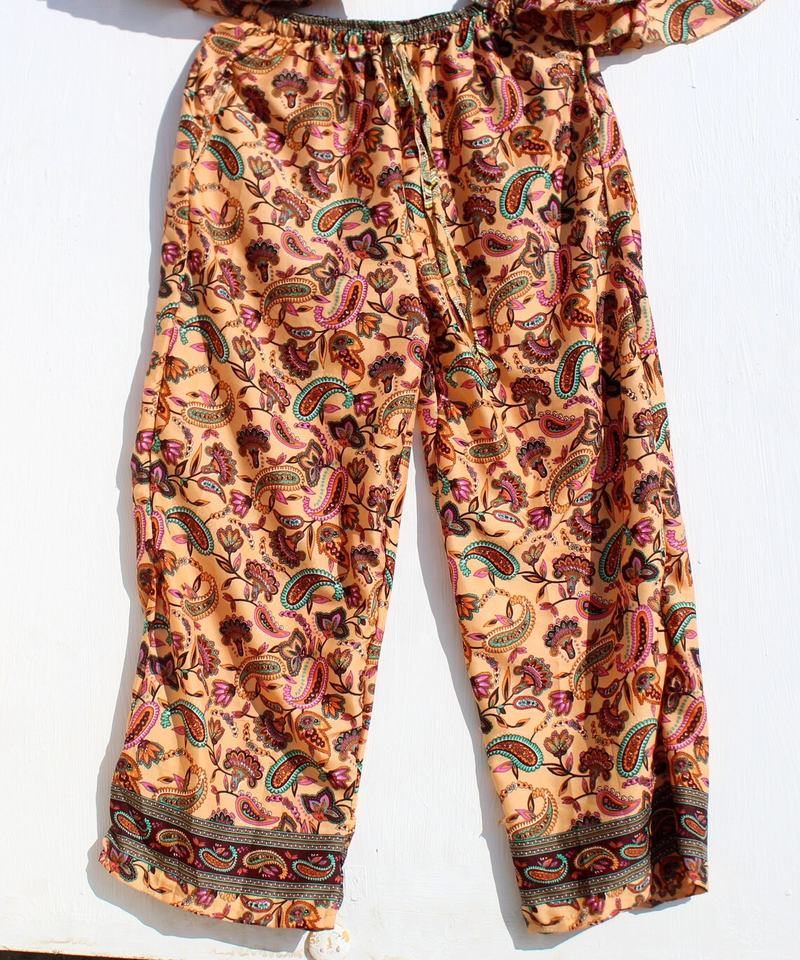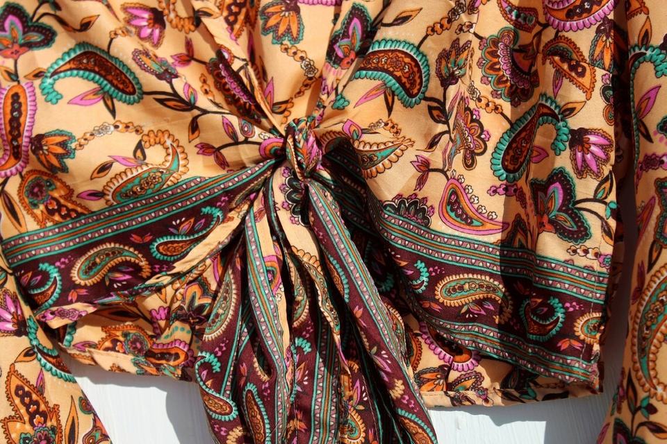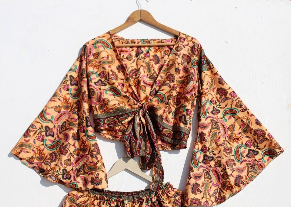 เสื้อผูกเน็คไทผ้าไหมทำมือพิมพ์ลายดอกไม้สำหรับผู้หญิงมาใหม่พร้อมกางเกง Palazzo เสื้อครอปและแขนกระดิ่งผ้าชีฟองสั้น